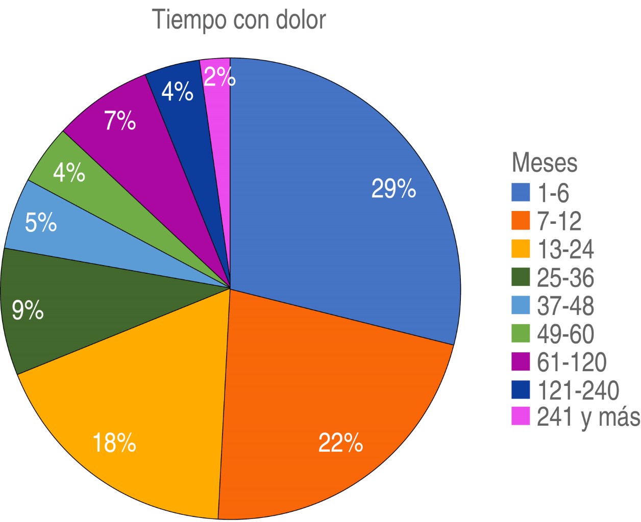 Respecto a la temporalidad, el dolor de tipo crónico se presentó en el 83% de las consultas de primera vez y se categorizó en dolor crónico agudizado (43%) y no agudizado (45%). Mientras que el dolor agudo tuvo una prevalencia de 12%.
