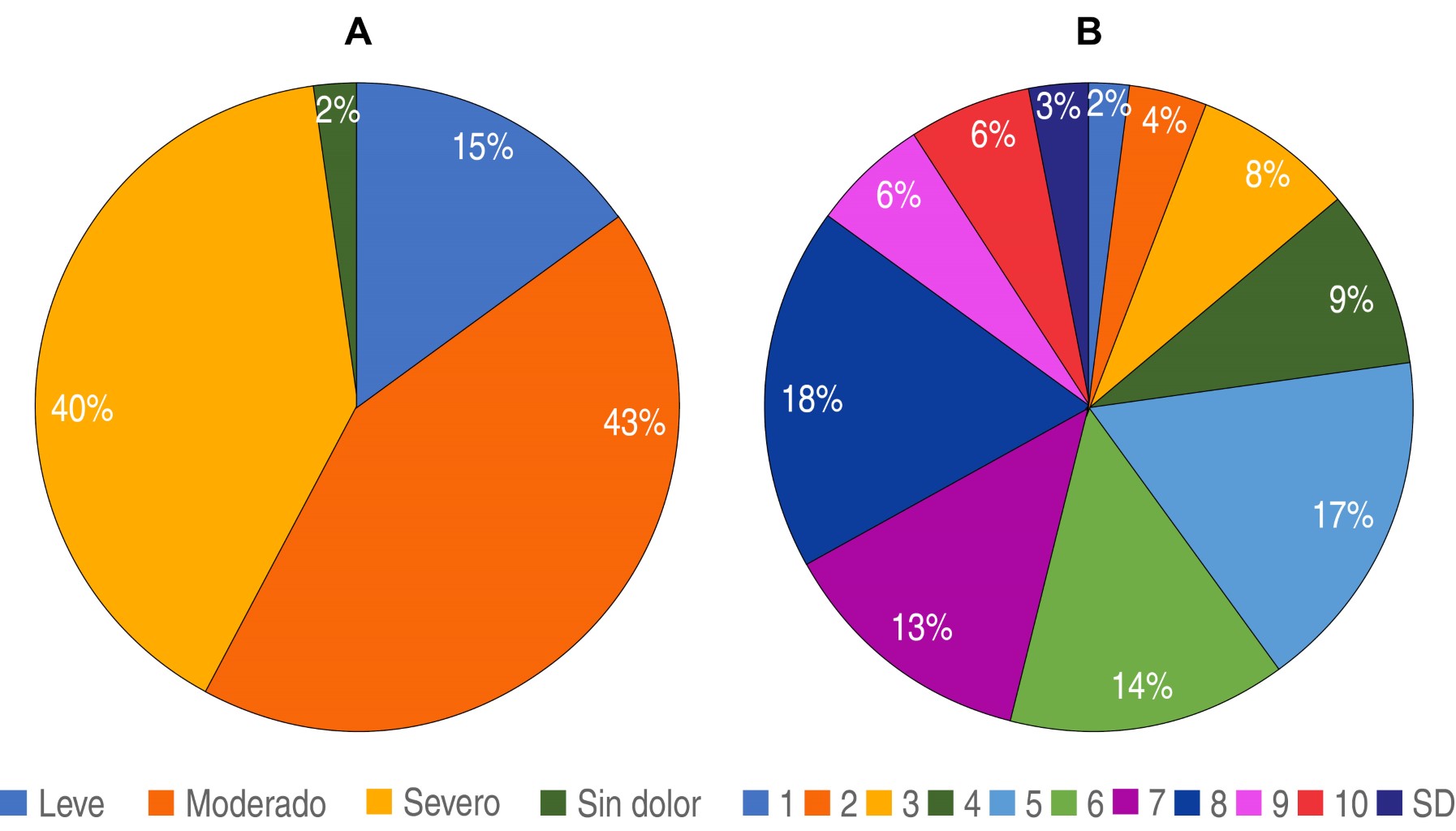 Por otra parte, en la Figura 4 se observan los resultados de la valoración de la intensidad del dolor por medio de dos escalas unidimensionales: 1) escala visual analógica (EVA) y 2) escala verbal analógica (EVERA). De acuerdo con la EVA, la intensidad del dolor fue evaluada en una media de 6 (± 2.4). Con la EVERA se reportó dolor de intensidad moderada en el 43% (1,952) y severa en el 40% (1,795) de los pacientes.