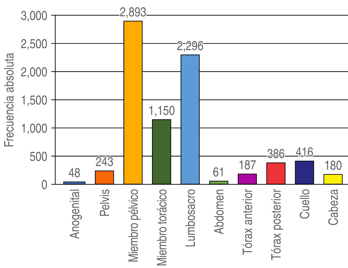 La dinámica de presentación del dolor que se reportó con mayor frecuencia fue de tipo continuo fluctuante en el 74.5% de los casos. Los sitios de localización anatómica del dolor se encuentran graficados en la Figura 5; los sitios referidos con mayor frecuencia fueron: dolor localizado en piernas con el 64%, dolor lumbosacro con el 51% y dolor en brazos con el 25.5%. El 40% de pacientes refirieron simultáneamente dolor localizado en región lumbosacra y en piernas.
