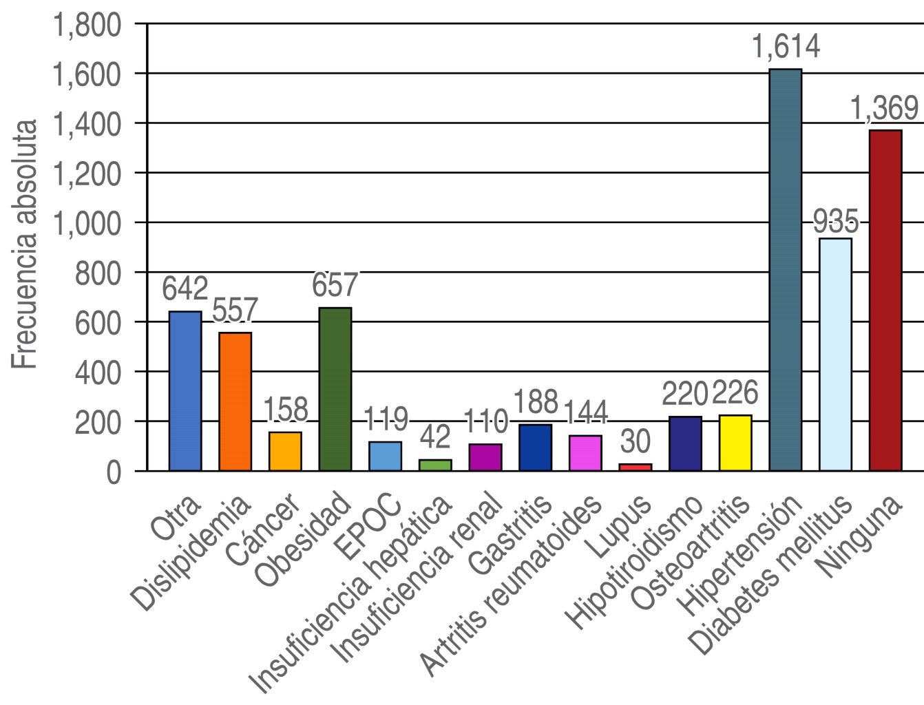 Las comorbilidades que refirieron los pacientes se muestran en la Figura 6, las enfermedades más frecuentes fueron de tipo crónico degenerativo, la hipertensión arterial en el 35.7% (1,614) de los pacientes y diabetes mellitus en el 20.7% (935) fueron las más frecuentes. Sólo el 30% (1,369) de los pacientes no tuvieron comorbilidades.