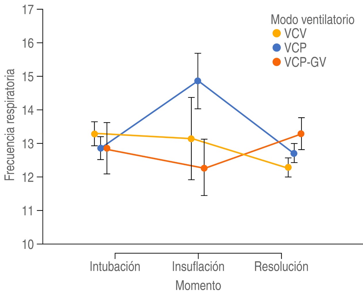 En la frecuencia respiratoria no encontramos diferencias estadísticamente significativas en cuanto al comportamiento de la frecuencia respiratoria entre los grupos y en los diferentes momentos del seguimiento (Figura 1). Sin embargo, el grupo VCP, al momento de la insuflación mostró mayor incremento en su frecuencia respiratoria.