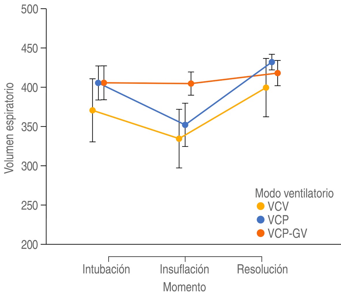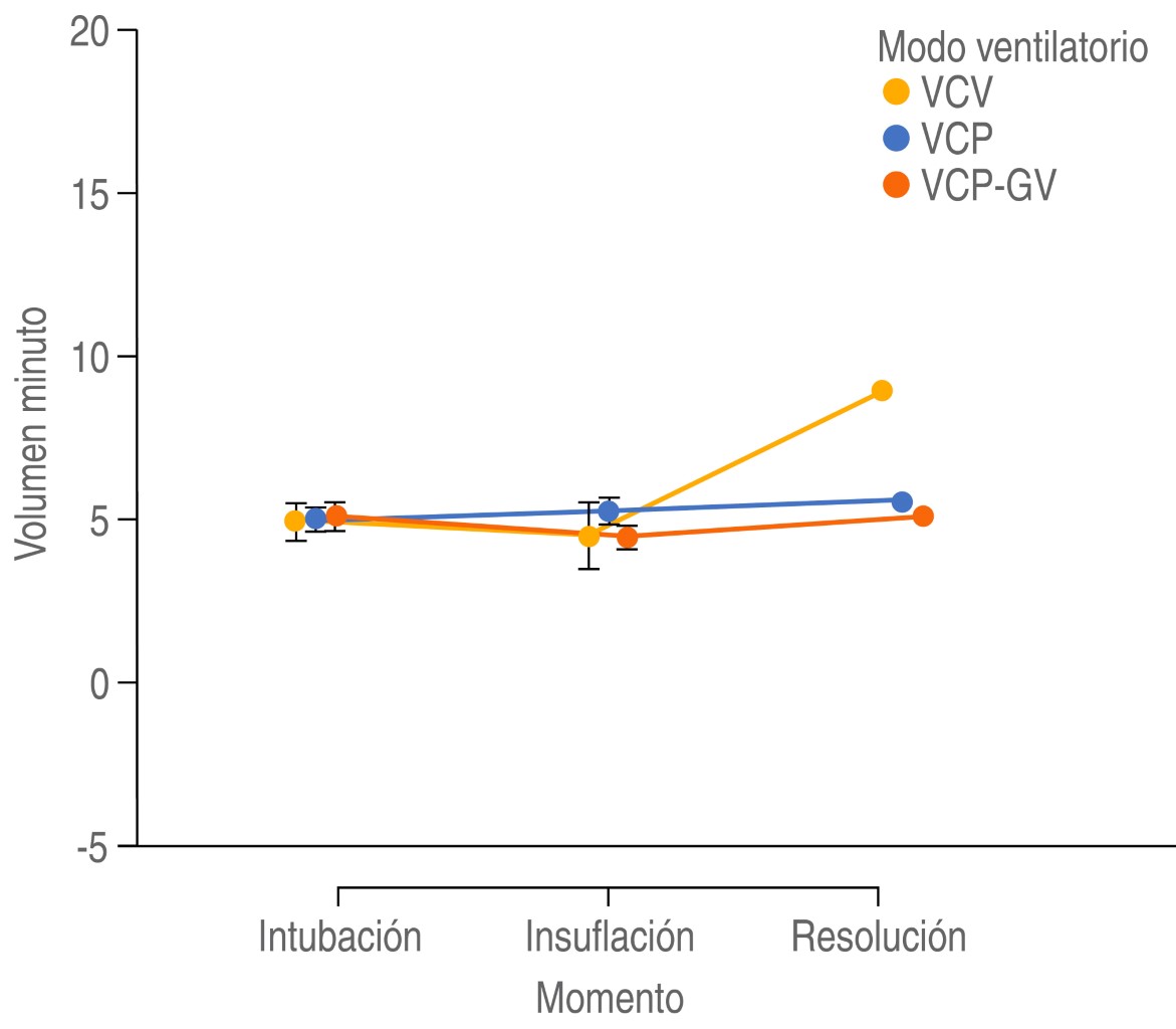 Para el volumen espiratorio se observaron variaciones entre los momentos en los tres grupos, con evidencia de reducción mayor para los grupos VCV y VCP durante la insuflación. El grupo VCP-GV se mantuvo más estable (Figura 2). Al final, en todos los grupos se recuperó el volumen espiratorio a cifras cercanas a lo basal, sin diferencias entre grupos.