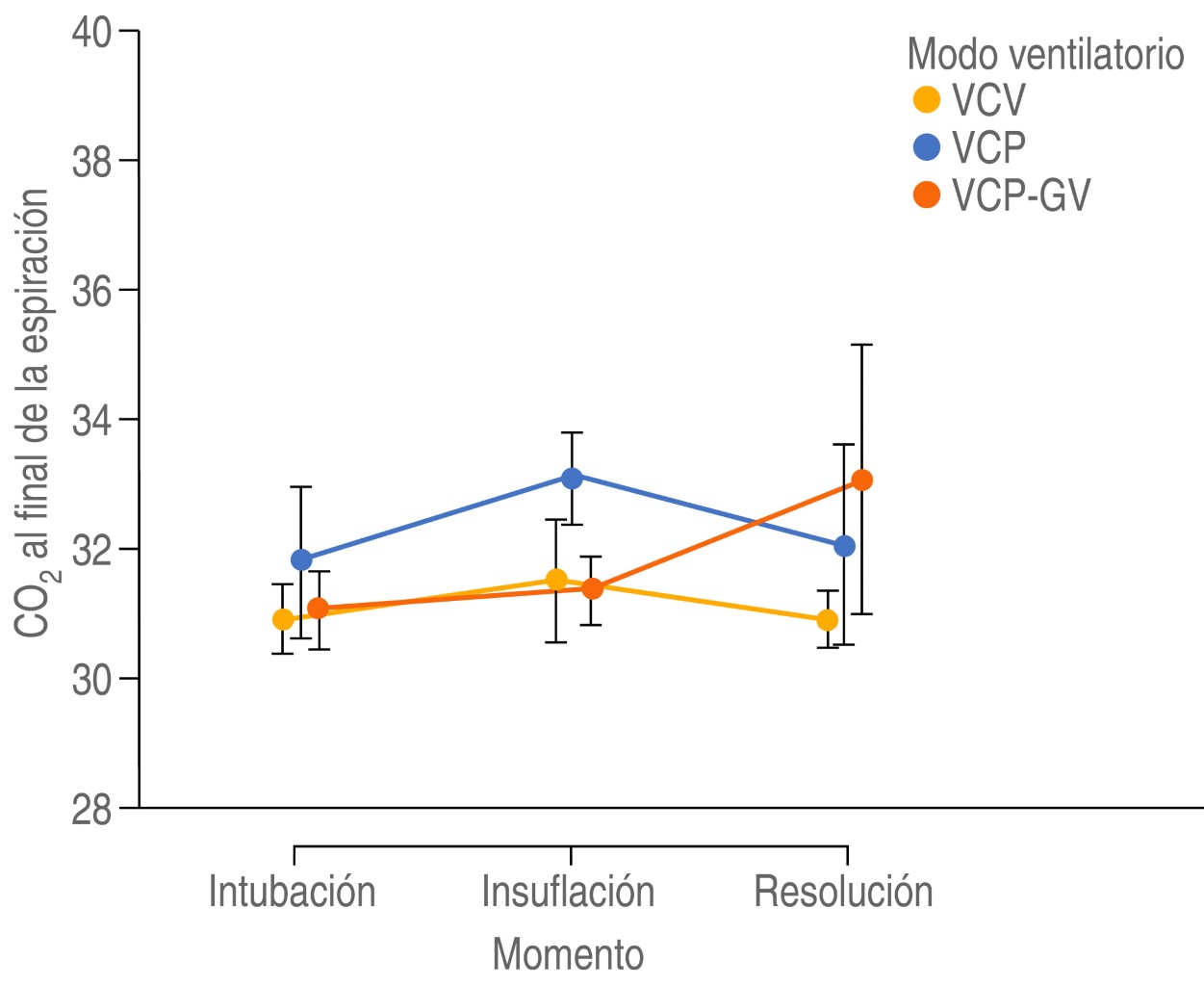Con respecto al dióxido de carbono al final de la espiración (EtCO2) durante la anestesia, se mantuvo estable en los tres modos de ventilación (Figura 3).