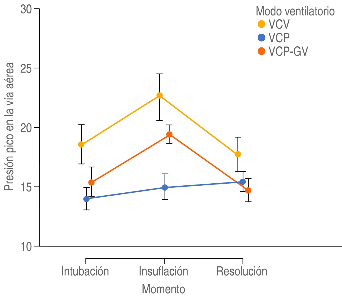 En la medición de las presiones pico en la vía aérea sí encontramos diferencias según el modo de ventilación. Para los modos VCV y VCP-GV aumentó durante la insuflación con recuperación en la resolución (p < 0.001). Asimismo, el grupo con VCV en todo momento mostró ser mayor al de VCP-GV, aunque esta diferencia no alcanzó la significancia estadística (p > 0.05). Con relación al modo VCP, sus presiones se mantuvieron estables durante los tres momentos de evaluación y sólo fue diferente al modo VCV durante la insuflación (p = 0.01). Nuevamente, la resolución en todos los grupos se normalizó la presión pico (Figura 4).