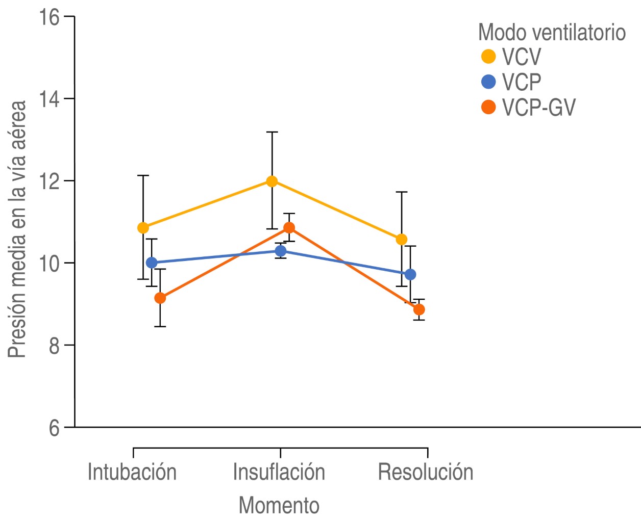 La presión media durante el ciclo respiratorio fue escasamente modificada durante el procedimiento, principalmente durante la insuflación en los grupos de modo VCP y VCP-GV (Figura 5).
