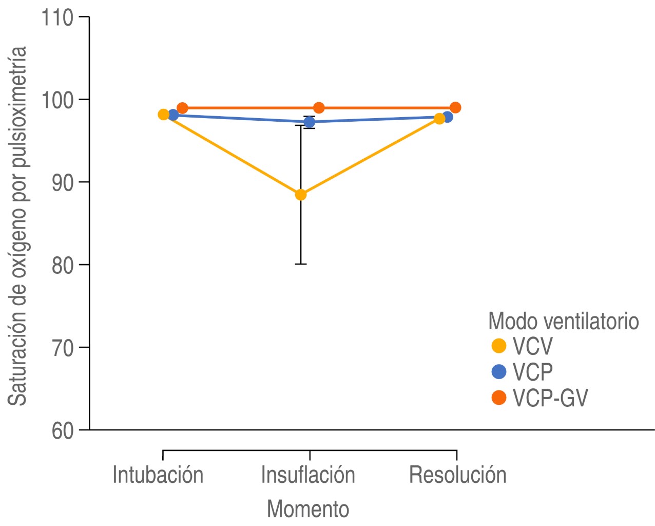 La saturación de oxígeno medida por pulsioximetría evidenció estabilidad en todo el procedimiento y sin diferencias entre las modalidades de ventilación (Figura 7).