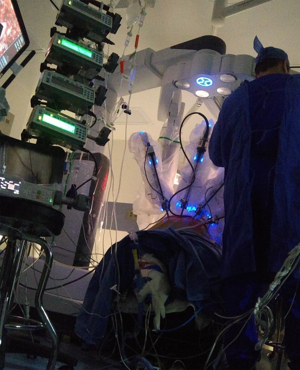 Dentro de las ventajas para el paciente: las incisiones son pequeñas con mejores resultados estéticos, hay menor necesidad de transfusiones, menos dolor postoperatorio, reducción del tiempo de hospitalización, incorporación rápida a las actividades del paciente, alteración menos expresiva en los valores del hematocrito. El grado de dificultad para el manejo anestésico se incrementa, ya que es imperativo invadir al paciente con el monitoreo necesario previo al evento quirúrgico, dependiendo de las condiciones clínicas en las que se encuentre el paciente (monitoreo tipo I y monitoreo tipo II). La posición que adopta el paciente durante la cirugía es con los brazos a los costados del cuerpo para que los brazos robóticos puedan abordar al paciente durante la cirugía. La posición de Trendelenburg es muy forzada, aproximadamente de 60o a 84o de inclinación, la posición del paciente debe ser estrechamente vigilada para evitar cualquier daño neurológico, artralgia o lesión digital, los hombros y los pies deben quedar apoyados adecuadamente y el tórax debe quedar fijo sin que su expansión quede comprometida durante la ventilación.