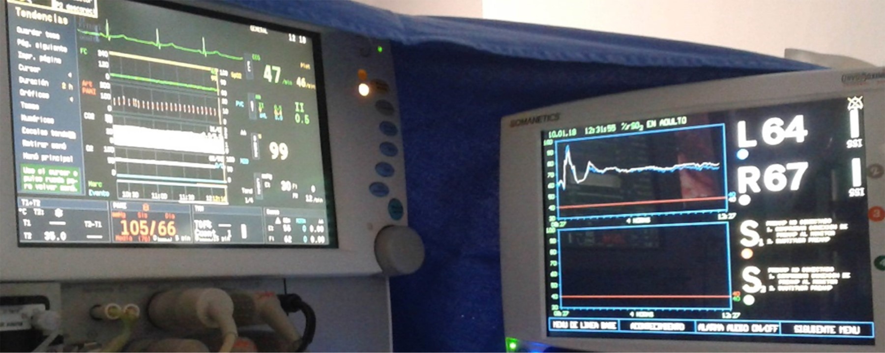 Signos vitales basales e iniciales: TA 131/87, FC 66X', SpO2 94%. BIS: 87-90 Hz, NIRS L73, R77. Se coloca mascarilla facial con O2 a 3 L/min, sujeto con un soporte facial. Se iniciaron perfusiones continuas intravenosas modo manual de manera simultánea con las bombas Smiths Medical Medex 3500. Lidocaína simple a 1 mg/kg/h, dexmedetomidina 0.5 μg/kg/h. Iniciando perfusiones de lidocaína simple y dexmedetomidina 20 minutos previo a inducción. Inducción: fentanilo 2 μg/kg iv, en perfusor Mindray Benefusion SP5 Propofol TCI sitio efecto Modelo Schnider 2.4 μg/mL iv, rocuronio 0.6 mg/kg iv en bolo inicial. Previa desnitrogenización con mascarilla facial a 3 L/min por dos minutos. Laringoscopía directa con hoja Macintosh No. 4, intubación de primera intención con tubo endotraqueal armado No. 8.5 con 4 cm3 de neumotaponamiento punta atraumática, se verifica adecuada estancia de tubo endotraqueal mediante auscultación de campos pulmonares a nivel apical y basal, clínica y capnografía. Se fija tubo endotraqueal de manera muy minuciosa y precisa; valoración de Cormack-Lehane II. Se verifica respuesta a nivel pupilar (mióticas, simétricas, concéntricas). Se inserta termómetro transnasal y se coloca sonda orogástrica de 18 French de primera intención corroborando estancia de sonda en cavidad gástrica. Se colocan protecciones en ambos ojos y en la zona de la boca. Parámetros ventilatorios: modo control volumen, VT: 400-450 mL, de manera inicial, FR: 15-20X', Relación I:E: 1:2, PEEP 4-6 cmH2O, Pmáx: 16-21cm H2O, FiO2 al 60%. Con el paciente en posición supina y neutra se toma línea arterial radial izquierda con jelco calibre No. 20 permeable a solución de NaCl de 250 mL con 1,000 UI de heparina, posteriormente se canaliza vena periférica en antebrazo izquierdo con catéter venoso periférico No. 18, permeable a solución Ringer lactato.
