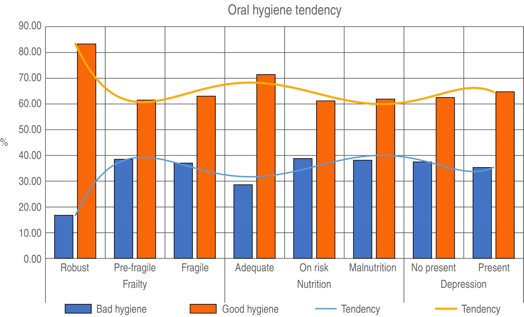 Conclusión: la presencia del síndrome de fragilidad, la desnutrición y la depresión fue mayor en pacientes con prótesis, xerostomía y mala higiene bucal. El análisis estadístico no mostró significancia en la asociación de riesgo entre condiciones de salud bucal y depresión, desnutrición o fragilidad. Estos resultados destacan la importancia de la búsqueda de patologías bucales durante la valoración geriátrica integral.
