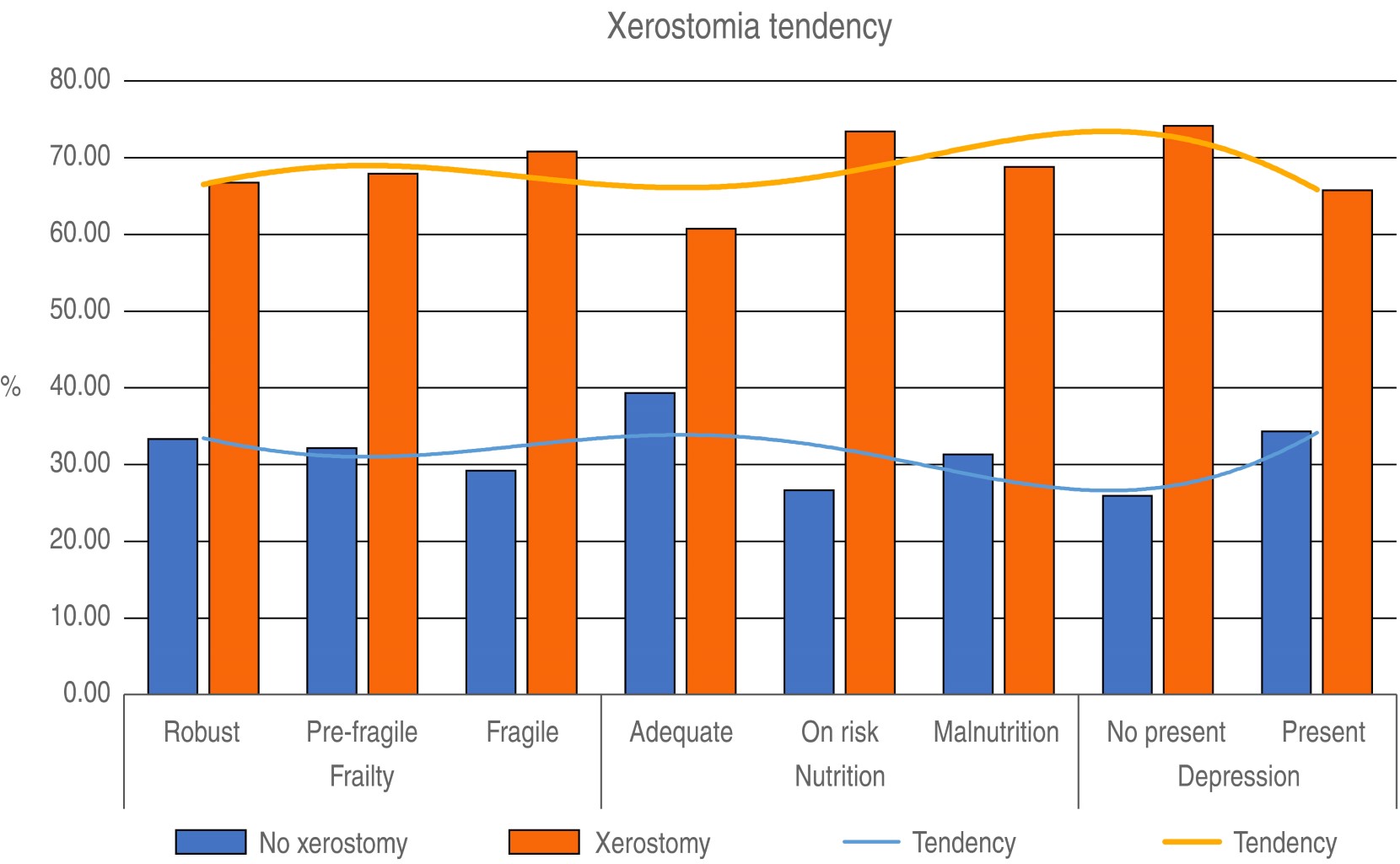 Resultados: La media de edad fue de 78.76 ± 7.08 años, siendo el sexo femenino 74.2%. La cantidad total de pacientes desdentados fue del 25.8% y hasta un 60.5% requirió algún tipo de prótesis. 59.4% de los participantes desdentados cumplieron el diagnóstico de síndrome de fragilidad. 53.5% de los participantes con xerostomía se clasificaron dentro del síndrome de fragilidad. El análisis de regresión logística no mostró diferencia estadísticamente significativa.