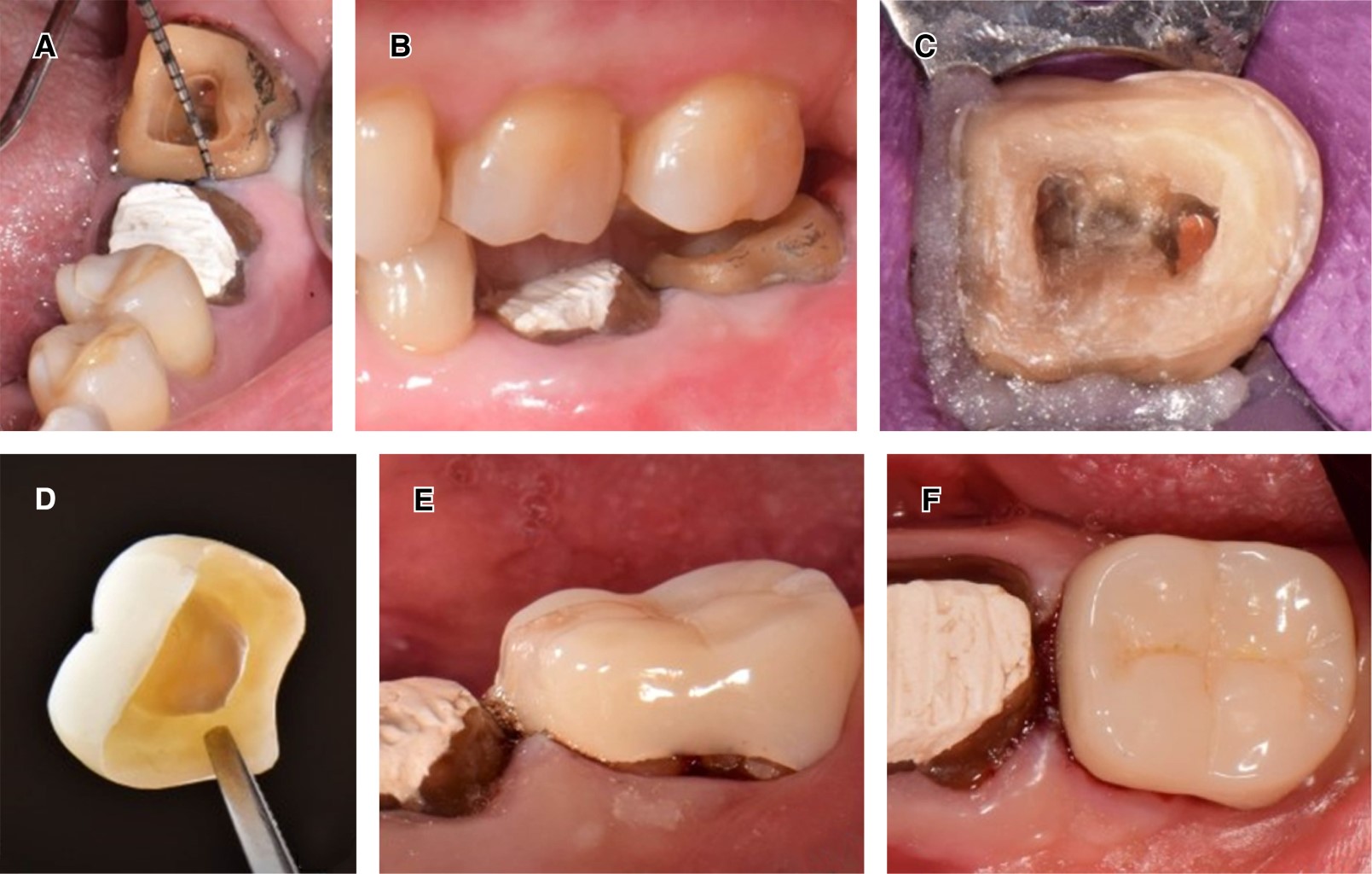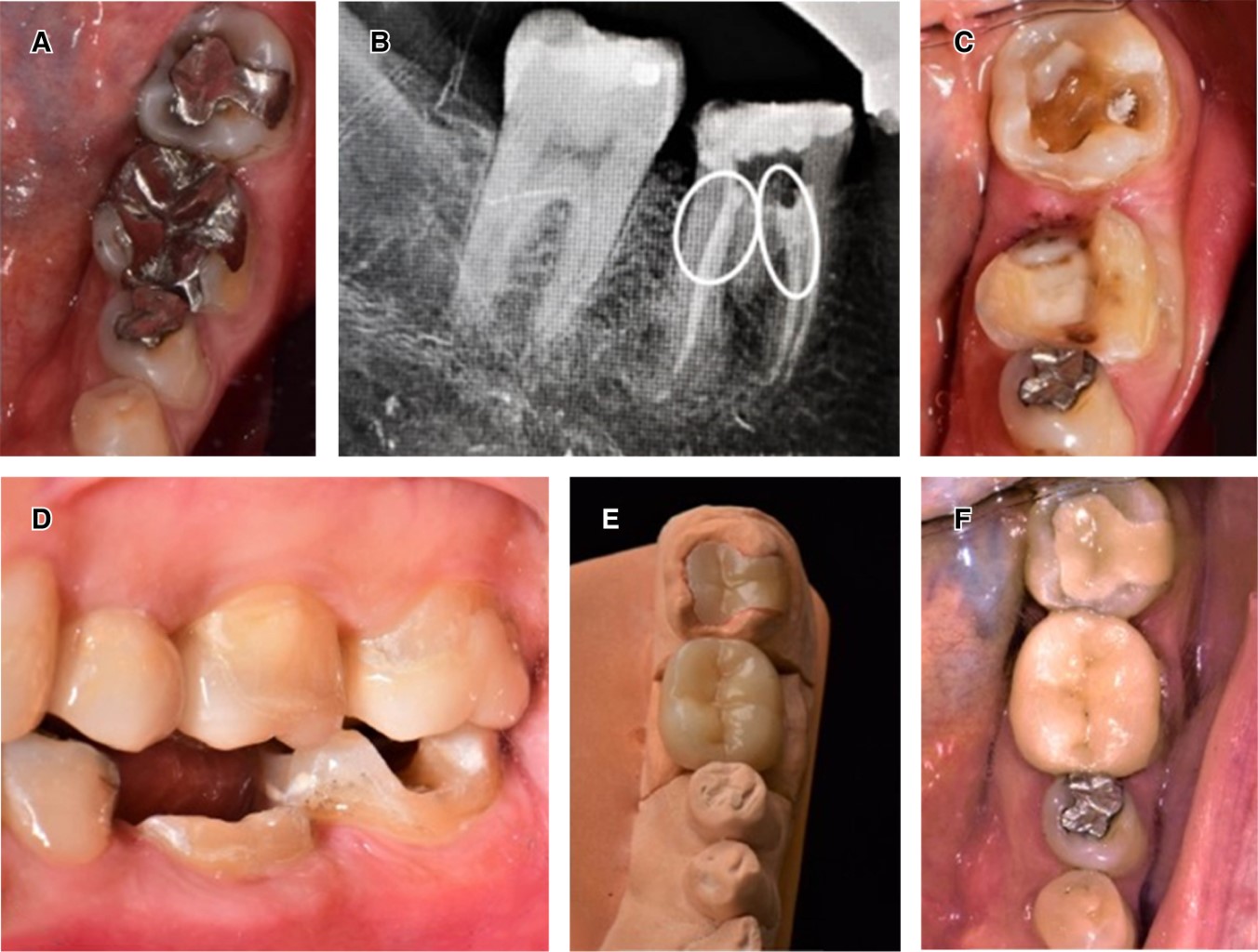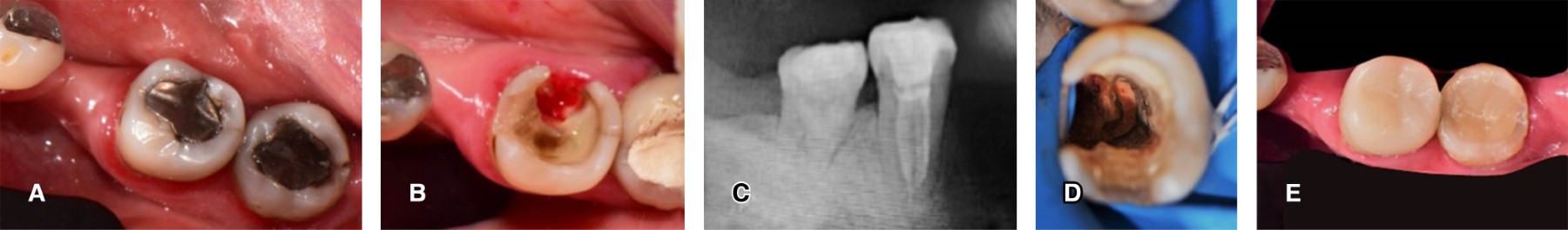 Mujer de 48 años con síndrome de Sjögren secundario acude a consulta para tratamiento integral a la misma clínica de la misma institución. Para rehabilitar los dientes 37 y 36, se eliminan las obturaciones previas y la remoción de lesiones de caries circundante y en cervical del diente 36 (Figura 2A), donde se evidencia gran pérdida de tejido tanto coronal como radicular, con el diagnóstico endodóncico de pulpitis irreversible asintomática, se procede a realizar el tratamiento de conductos, se observa una raíz cónica y una disposición de conductos en C (Figura 2B-C). Terminado el tratamiento de conductos, se determina la colocación de una endocorona ante la imposibilidad de retención de un poste intrarradicular por la disposición de los conductos y el grosor de las paredes radiculares. Se sella el tercio cervical con ionómero de vidrio fotopolimerizable VitrebondTM (3M-ESPE) (Figura 2D).