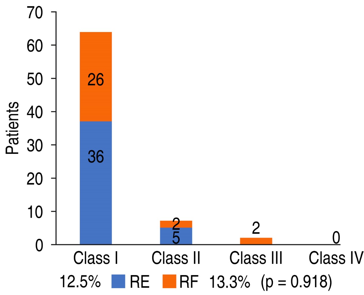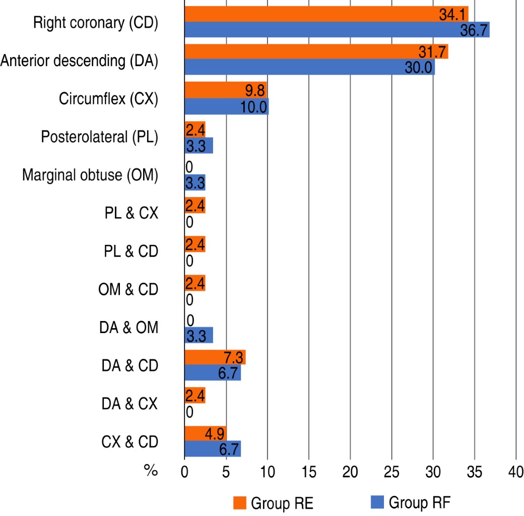Resultados: Se evaluaron 71 pacientes, en un contexto de angina crónica estable, en la Unidad Médica de Alta Especialidad del Bajío, del periodo de enero de 2013 a febrero de 2020, se obtuvieron 41 pacientes con revascularización exitosa (RE) y 30 con revascularización fallida (RF). La tasa de éxito de revascularización fue de 57.7%. La tasa de eventos cardiovasculares mayores encontrados entre pacientes con RE vs RF en este estudio fueron: eventos de angina inestable postrevascularización en 12.5% del grupo RE y en 13.3% del grupo RF (p = 0.918). El grupo de revascularización exitosa tuvo ausencia de infartos agudos al miocardio y en 3.3% del grupo RF (p = 0.245) sí hubo. Ocurrió muerte de origen cardiaco en 0% del grupo RE y en 3.3% del grupo RF (p = 0.245). Mientras que tuvieron necesidad de nueva vascularización el 0% del grupo RE y el 6.7% de los pacientes del grupo RF. La tasa de supervivencia de pacientes con RF fue de 96.7% y en pacientes con RE fue de 100%.