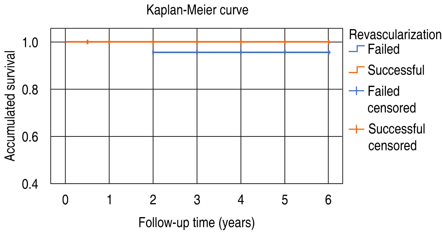 Conclusiones: La revascularización exitosa vs fallida no demostró diferencias estadísticamente significativas en la tasa de eventos cardiovasculares mayores