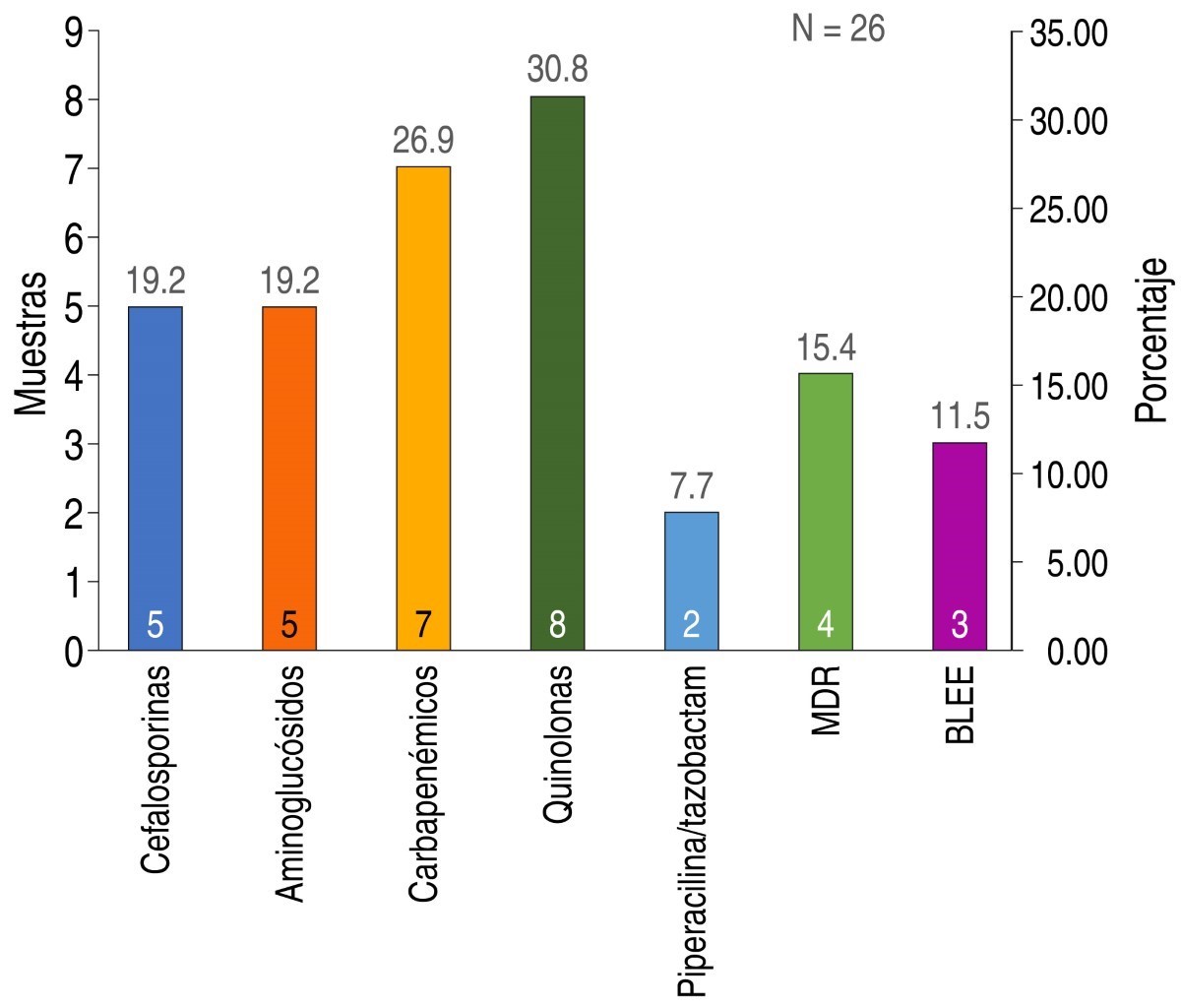 Se obtuvo un total de 26 muestras de hemocultivo con aislamiento positivo para Pseudomonas aeruginosa, de los cuales se registró el siguiente perfil de resistencia antimicrobiana: resistencia a cefalosporinas antipseudomonas (se incluyeron ceftazidima y cefepima) de 19.2% (n = 5), patrón BLEE (betalactamasas de espectro extendido) en 11.5% (n = 3), resistencia a carbapenémicos (meropenem, imipenem) en 26.9% (n = 7), resistencia a aminoglucósidos (amikacina, gentamicina) en 19.2% (n = 5), resistencia a quinolonas (ciprofloxacino, levofloxacino) en 30.8% (n = 8), resistencia a piperacilina/tazobactam de 7.7% (n = 2). De igual manera, se documentó una resistencia a tres o más familias de antibióticos (MDR = multidrogorresistencia) en 15.4% (n = 4) (Figura 1).