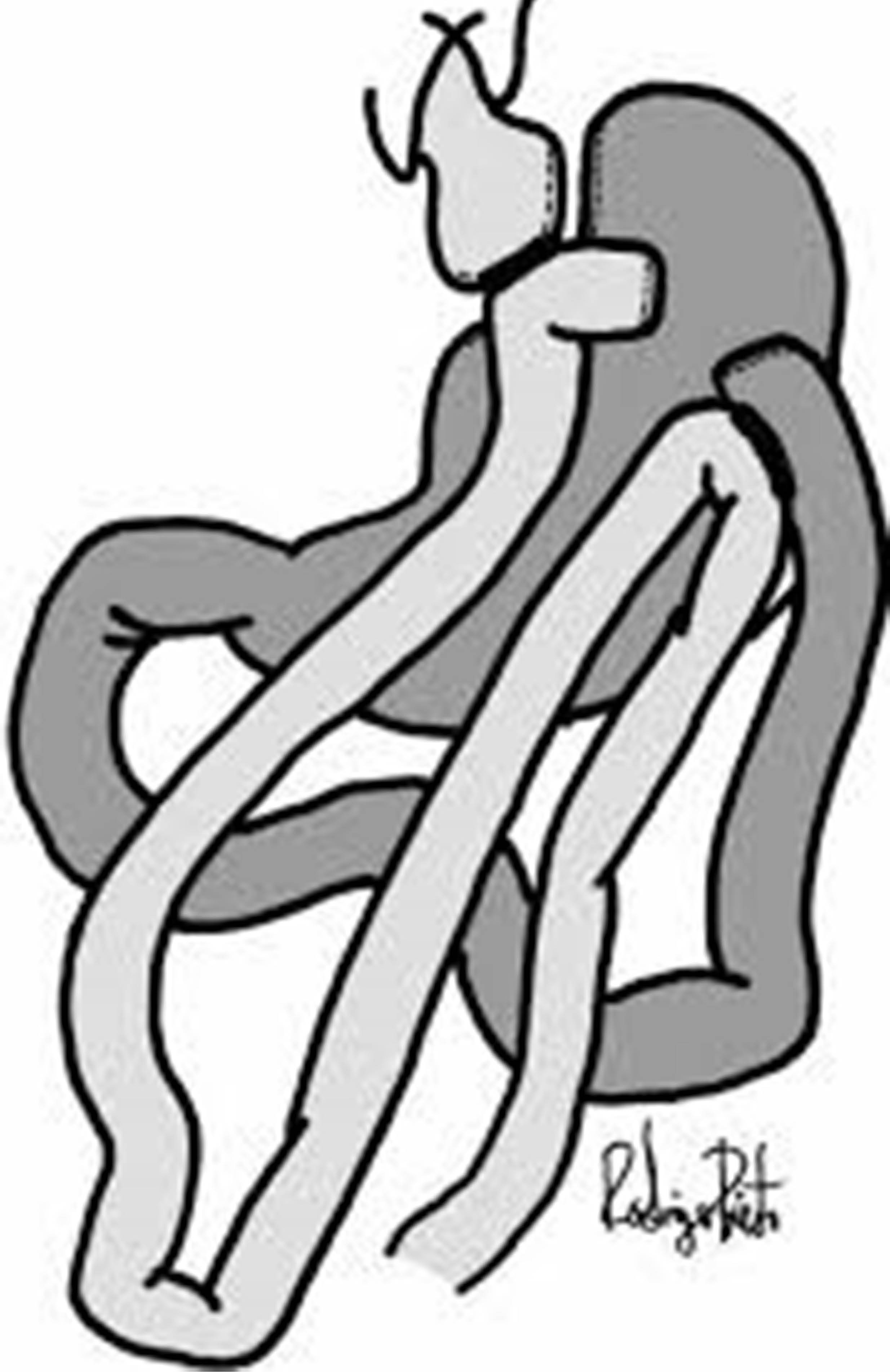 Técnica quirúrgica: A todos los pacientes se les realizó la misma técnica quirúrgica: Bypass gástrico simplificada como fue descrita originalmente por Hans Lonroth en 1996, que es una derivación de dos anastomosis en Y de Roux (Figura 1), con una longitud de asa biliar entre 100 y 120 cm, y una longitud de asa alimentaria entre 80 y 100 cm (Figura 1).