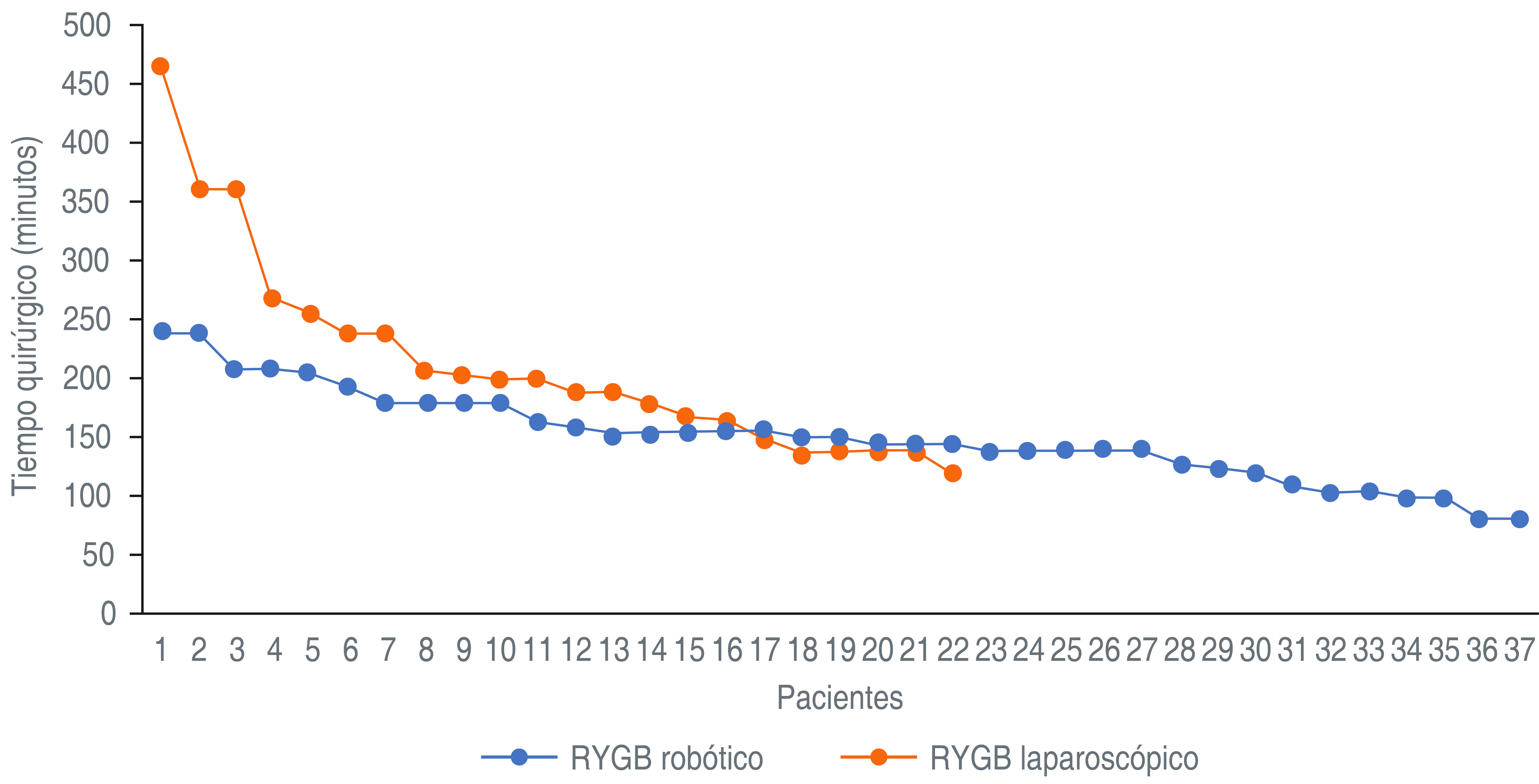 En el presente estudio, la mejora más destacada con el uso del robot Da Vinci fue el tiempo quirúrgico (151.68 ± 39.11 minutos), lo cual disminuyó en promedio 64 minutos con respecto al laparoscópico. Este tiempo quirúrgico es incluso menor que el reportado en la mayoría de los estudios de bypass gástrico robótico, incluso aunque éstos fueron realizados en obesos mórbidos y no en superobesos. Esto podría explicarse dado que, en el Centro Médico Nacional 20 de Noviembre, se tiene una sistematización precisa y estandarizada, paso por paso, del procedimiento del bypass gástrico, asimismo, se realiza el procedimiento simplificado en asa que no requiere cierre de brechas mesentéricas, pues estas son mínimas o nulas.