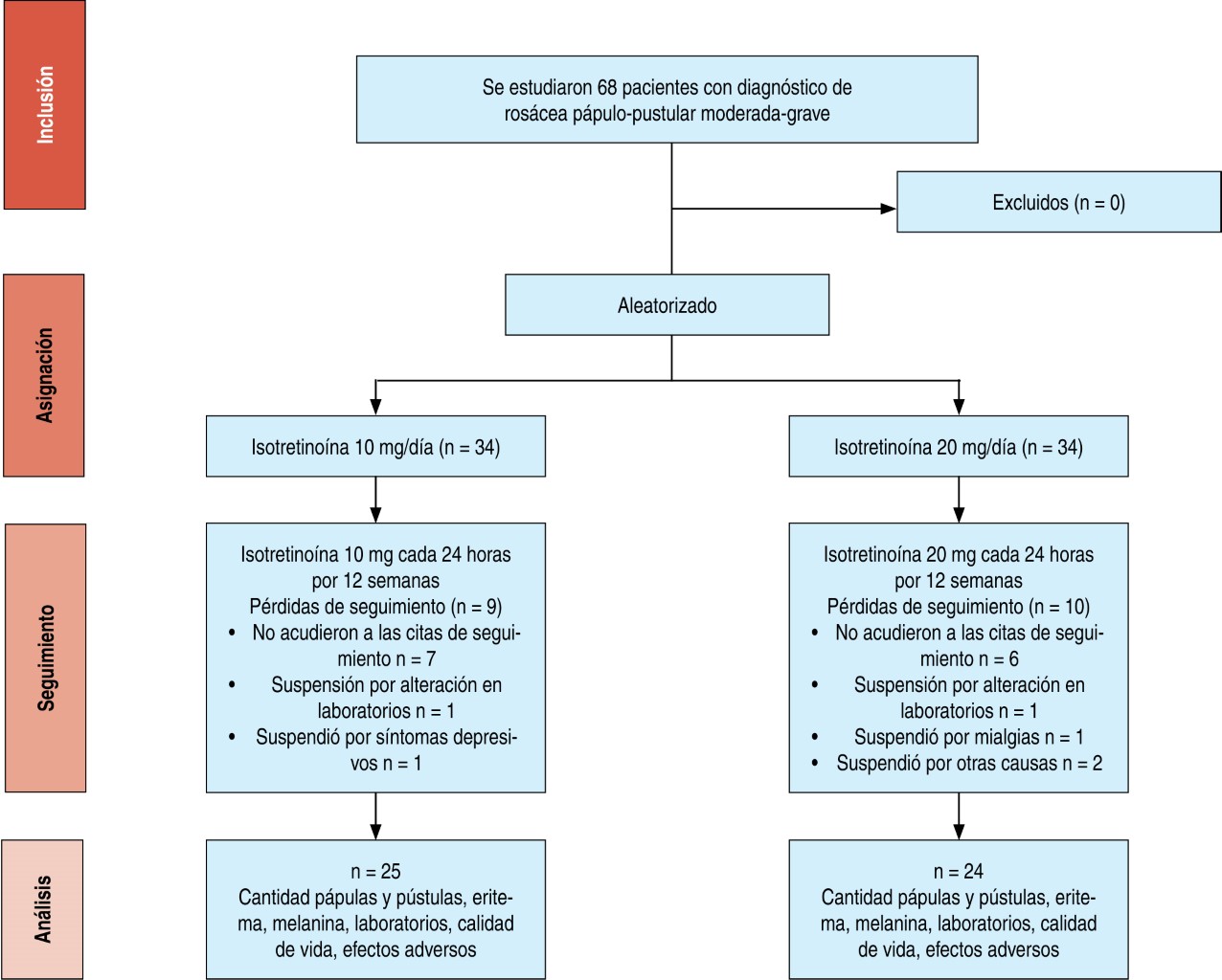 Los participantes que cumplieron los criterios de selección del estudio fueron asignados aleatoriamente (lista creada en sealedenvelope.com) a alguno de los dos grupos de intervención: el grupo A recibió 20 mg de isotretinoína al día, mientras que el grupo B recibió 10 mg al día, durante 12 semanas. Los participantes fueron evaluados a las cero, cuatro, ocho y 12 semanas de la intervención por un médico dermatólogo encargado de identificar y realizar el conteo de lesiones faciales. La variable de resultado principal fue el cambio en el número de lesiones inflamatorias y no inflamatorias. El eritema persistente y las telangiectasias se calificaron en una escala del 0 al 3 de acuerdo a su intensidad y frecuencia. También se cuantificó el índice de eritema y melanina (escala del 0 al 999) con la sonda Mexameter MX18 (Courage + Khazaka electronic GmbH). El mexámetro es un equipo que mide los dos principales componentes que dan el color a la piel: hemoglobina y melanina, a través de los principios de absorción y reflexión. Este equipo emite tres longitudes de onda de luz específicas y un receptor mide la luz reflejada. Al definirse la cantidad de luz emitida es posible calcular la luz absorbida por la piel. Se evaluó la calidad de vida utilizando la versión en español del cuestionario Dermatology Life Quality Index (DLQI), que a mayor puntaje indica una menor calidad de vida. Dicho cuestionario es un instrumento que consta de 10 ítems, cuyo marco temporal abarca los últimos siete días. Cada una de las preguntas incluye cuatro posibles respuestas con puntuaciones del 0 al 3. Las dimensiones de la calidad de vida que mide son: síntomas y percepciones, actividades diarias, ocio, trabajo/estudio, relaciones interpersonales y tratamiento. La puntuación va desde cero, que se traduce en un impacto mínimo en la calidad de vida, hasta 30 puntos, que refleja el máximo impacto en la calidad de vida. El conteo de lesiones, la medición de eritema, melanina, los estudios de laboratorio y la toma de fotografías se realizó a las cero, cuatro, ocho y 12 semanas del estudio. La calidad de vida se midió a las cero y 12 semanas, mientras que la recidiva se evaluó a las 24 semanas. Se definió recidiva como la presencia de más lesiones que las reportadas a las 12 semanas. Los efectos adversos se midieron por medio de evaluaciones clínicas y mediante bitácoras, donde se registró el día de inicio del síntoma y mediante pruebas de laboratorio durante las visitas cuatro, ocho y 12. El criterio para interrumpir las intervenciones fueron las alteraciones grado 2 de los resultados de los estudios de laboratorio, establecidos por el Instituto Nacional de Cáncer 2003, definidos como grado 2 aquéllos con los siguientes valores: triglicéridos 376-750 mg/dL, colesterol total 301-400 mg/dL, ALT/AST 101-200 mg/dL, leucocitos 2.0 a 2.9 × 103/mL, plaquetas 50-74 × 103/mL y hemoglobina 8-9.9 g/dL.