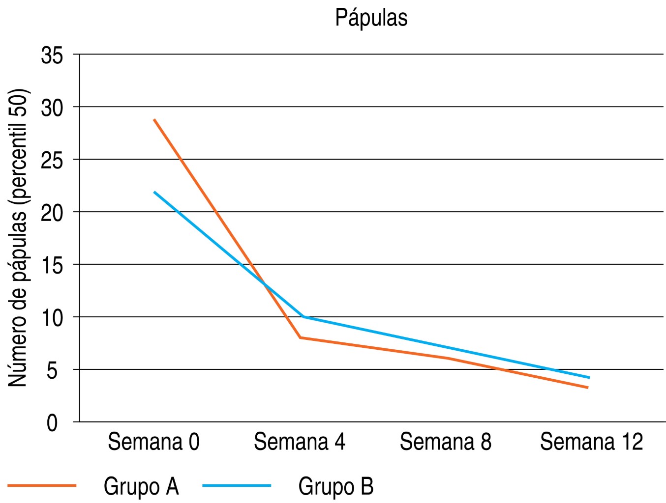 Al comparar los resultados en ambos grupos a la semana 12 de seguimiento, se encontró un mayor número de pápulas y pústulas en el grupo A (isotretinoína 20 mg) con una mediana de 29 pápulas (RIQ 20-41), y de 22 pápulas (RIQ 15-38) en el grupo B (isotretinoína 10 mg), p = 0.248. La mediana de pústulas contabilizadas fue de siete en el grupo A (RIQ 2-15) y de cinco en el grupo B (RIQ2-10), p = 0.519. La mediana de la calificación de las telangiectasias basales en el grupo A fue de uno y en el grupo B de dos, mientras que a la semana 12 fue de uno en ambos grupos, sin significancia estadística. El eritema transitorio basal en ambos grupos fue similar, dos (rango 2-3) y a las 12 semanas fue el mismo para ambos, dos (1-2), p = 0.694. Al comparar los resultados entre las visitas cuatro, ocho y 12 (Figuras 2 y 3), no se encontraron diferencias significativas en cuanto a pápulas, pústulas, telangiectasias o eritema transitorio entre los grupos de intervención (Tabla 2, Figuras 4 y 5).