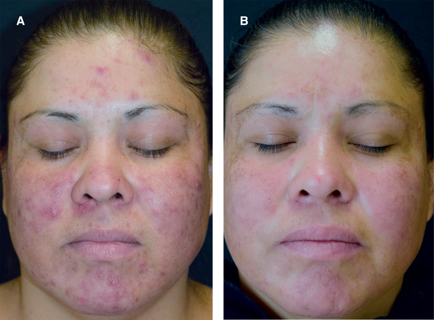 Es importante señalar que la principal limitación de este estudio fue el no completar el tamaño de muestra calculado para demostrar equivalencia de ambos esquemas terapéuticos (valor beta final de la muestra de 0.05). Sin embargo, las fortalezas metodológicas del mismo fueron la aleatorización de la asignación a las intervenciones, la evaluación de las lesiones inflamatorias por parte de un investigador cegado a las intervenciones y la medición objetiva del eritema y de la melanina utilizando la sonda mexámetro; así como el registro de los efectos secundarios a través de las bitácoras de los pacientes y de los estudios de laboratorio.