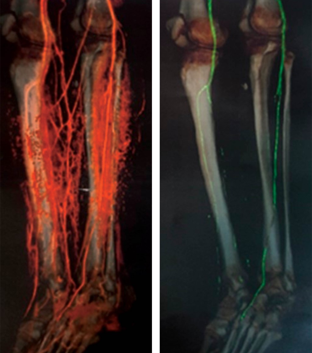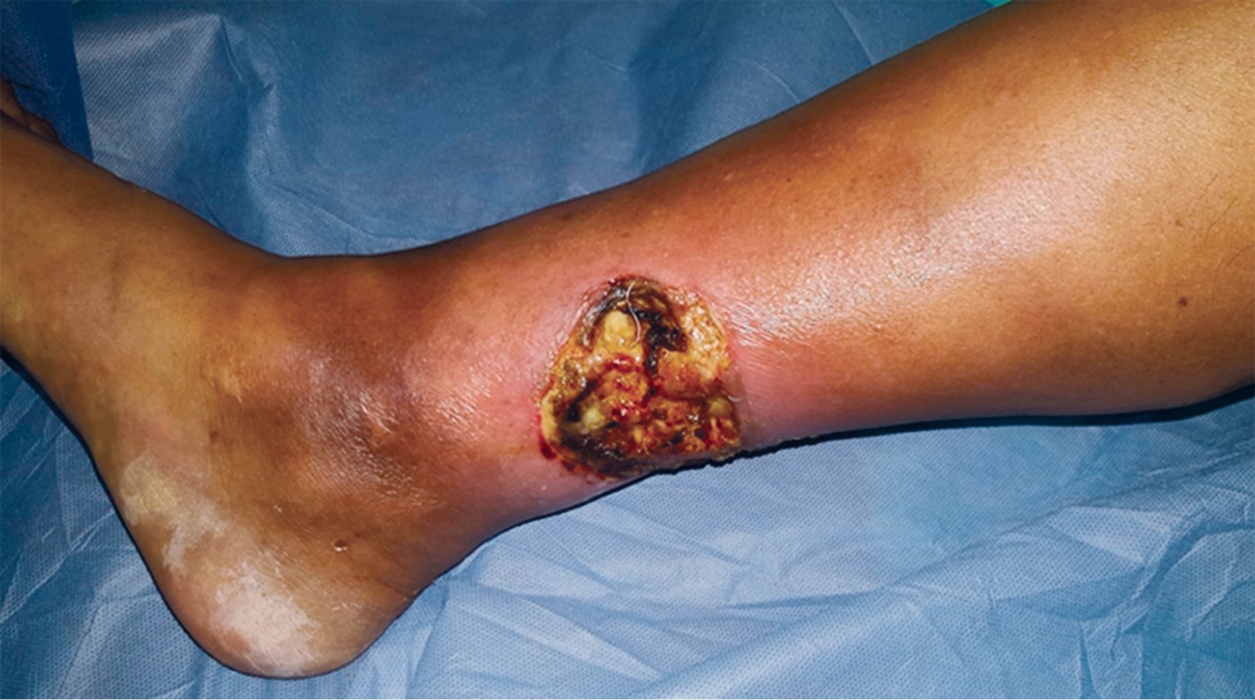 Paciente del sexo femenino, de 58 años, residente de la Ciudad de México, con insuficiencia renal crónica estadio V secundaria a hipertensión arterial sistémica, diagnosticada dos años antes, en tratamiento por servicio médico institucional con losartán, atorvastatina y eritropoyetina. Desde hace dos meses se encuentra en terapia de sustitución de la función renal con hemodiálisis tres veces a la semana. Acude a la consulta externa de dermatología por presentar desde hace 18 meses, una dermatosis diseminada a miembros inferiores que afecta cara externa de piernas derecha e izquierda, en tercio distal, bilateral y con tendencia a la simetría, constituida por dos úlceras, la mayor de ellas de aproximadamente de 6 × 4 cm, de forma irregular, con tejido de granulación y necrosis en la base, con bordes en sacabocado, regulares y bien definidos, con olor fétido, eritema, induración y costras en la periferia. De evolución crónica y muy dolorosa (Figuras 1 y 2). No se palpan los pulsos pedio y tibial posteriores de forma bilateral, y el estudio con ultrasonido Doppler manual demostró disminución del flujo vascular en ambas piernas. Se realiza una angiorresonancia que demuestra la presencia de calcificación arterial de miembros inferiores con insuficiencia arterial (Figura 3). Se solicitó la realización de un cultivo de la secreción de una de las úlceras, donde se observó desarrollo de Morganella morganii, sensible a amikacina, cefepima, ciprofloxacino y cefoxitina.