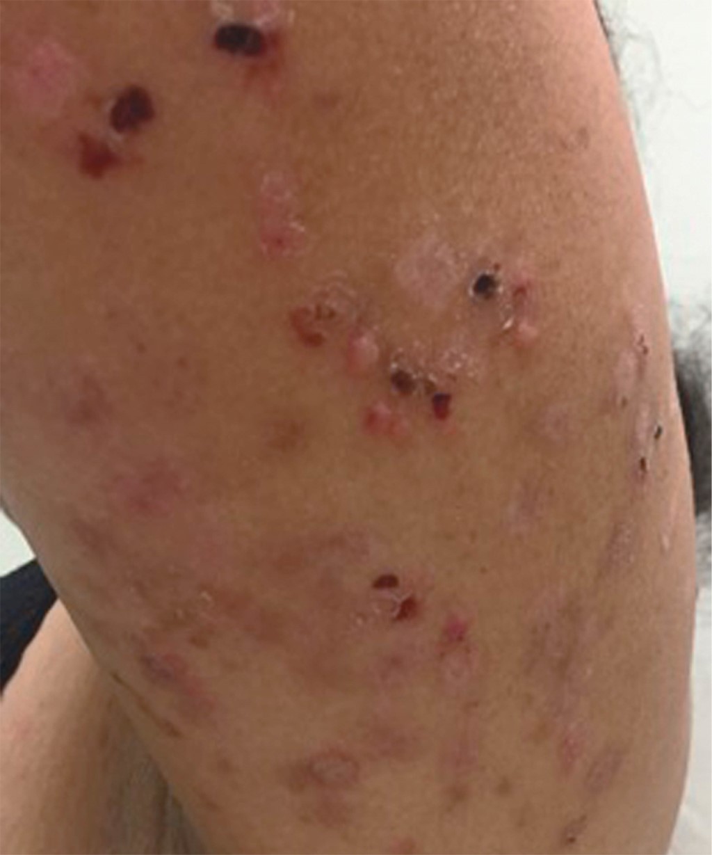 A la exploración física se observa una dermatosis diseminada, con tendencia a la generalización, respetando piel cabelluda, palmas y plantas (Figura 1), constituida por vesículas y ampollas tensas de contenido seroso de 3-8 mm, costras sanguíneas y hemáticas así como manchas residuales (Figura 2) que confluyen formando algunas placas. Evolución crónica y pruriginosa.