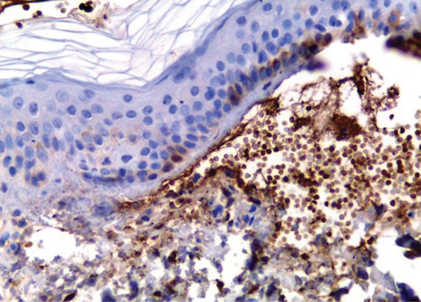 Se realiza biopsia de una de las vesículas, y con tinción de rutina se observó una ampolla subepidérmica (Figura 3) con restos de fibrina en el interior y presencia de polimorfonucleares (Figura 4), por lo que se solicita inmunofluorescencia e inmunohistoquímica para IgA e IgG (Figura 5), las cuales fueron reportadas como positivas, concluyendo que se trata de una enfermedad por IgA lineal.