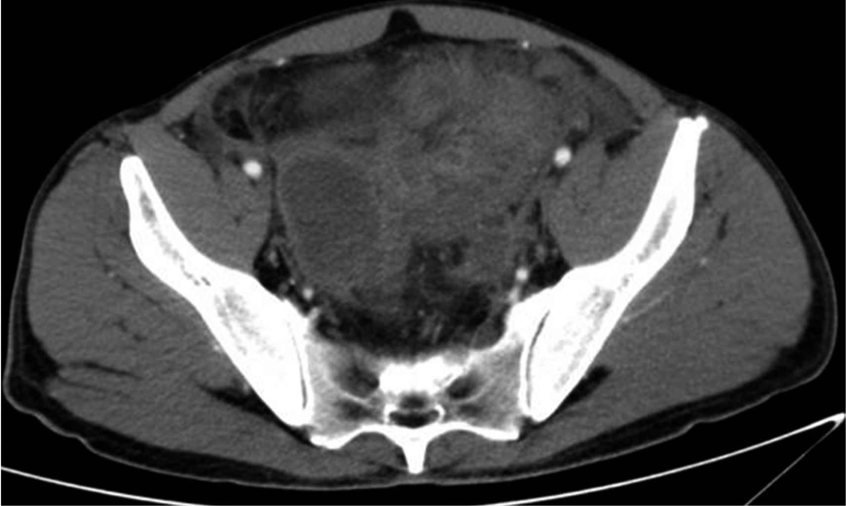 Masculino de 34 años que acudió al servicio de urgencias por dolor abdominal de 15 días de evolución asociado con náusea, intolerancia a la vía oral, escalofríos y diaforesis; recibió tratamiento antibiótico y analgésico no especificado sin mejoría del cuadro. Sin antecedentes de importancia familiares y/o personales. Signos vitales: TA 110/71, Fc 107, Fr 16, Sat 93%, Temp. 36.7 oC. A la palpación, el abdomen se mostró doloroso en cuadrantes inferiores, con plastrón en fosa iliaca izquierda y rigidez involuntaria sin rebote. En sus laboratorios de ingreso se destacaron: leucocitos 23.9 10^3/μl, seg 74%, bandas 6%, hb 13.8 g/dl, plq 466 10^3/μl, glu 87 mg/dl, cr 1.0 mg/dl, PCR 24.25 mg/dl, bilirrubina total 0.4 mg/dl y albúmina 3.8 g/dl.