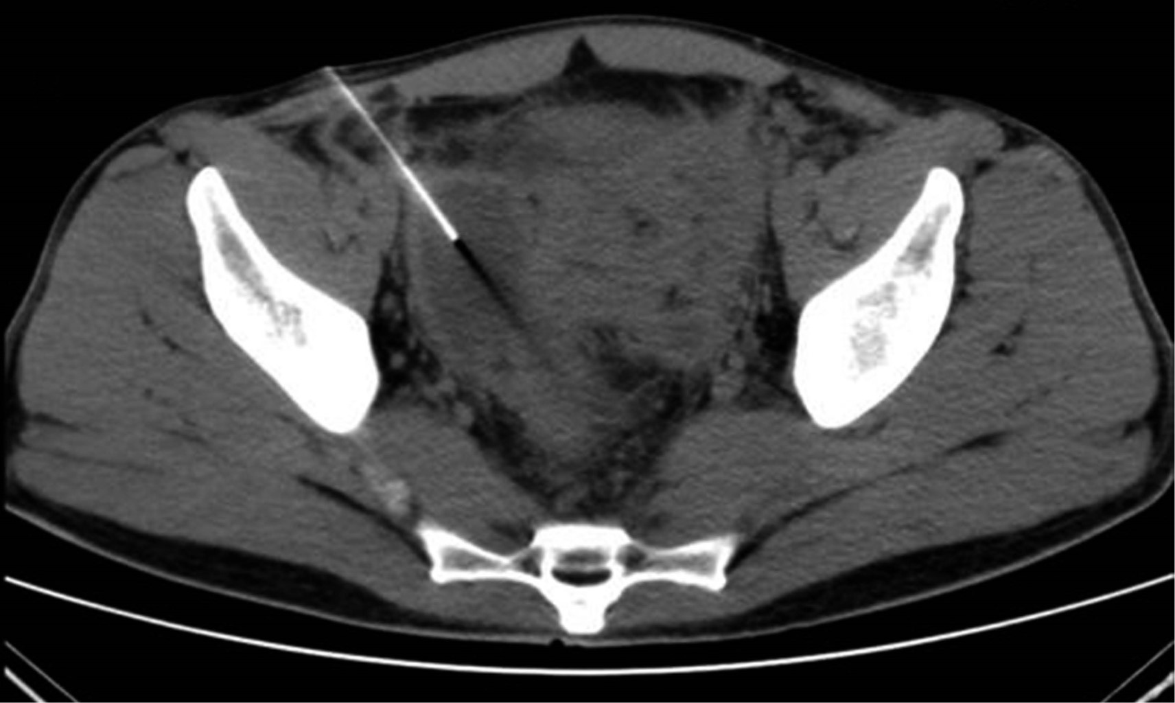 La tomografía de abdomen y pelvis con contraste iv demostró líquido libre en corredera parietocólica derecha, interasa y pericecal. Apéndice cecal con diámetro de 14 mm además de engrosamiento y realce de su pared. Colección supravesical con extensión a fosa iliaca derecha que mide 55 × 75 × 41 mm con un volumen calculado de 88 cm3 (Figura 1) y otra en fondo de saco con extensión a fosa iliaca izquierda que mide 60 × 57 × 70 mm con volumen de 125 cm3. Se decidió punción guiada por ultrasonido con control tomográfico de ambas colecciones (Figura 2), drenando 70 y 120 cm3 purulentos respectivamente. Se dejaron dos drenajes tipo Dawson Mueller® 10.2 fr, uno en fosa iliaca derecha y otro en fondo de saco. Se inició manejo antimicrobiano de amplio espectro con meropenem 1 g iv cada ocho horas y vancomicina 1 g iv cada 12 horas, se dejó en ayuno dos días y se inició apoyo nutricional parenteral durante tres días con oliclinomel®. El cultivo aeróbico desarrolló Streptococcus constellatus sensible a ertapenem, por lo que se cambió cobertura antimicrobiana a base de ertapenem 1 g iv cada 24 horas y vancomicina. El paciente se mantuvo clínicamente estable, sin datos de respuesta inflamatoria sistémica y disminución progresiva del dolor abdominal. Una TAC de control en su tercer día (Figura 3) demostró una disminución importante del líquido en el interior de las colecciones. Se retiró el drenaje derecho en su cuarto día, con un gasto total de 10 cm3; los marcadores inflamatorios presentaron una disminución progresiva durante su estancia, egresándose con 9.9 10^3/μl leucocitos, seg 67%, bandas 0 % y PCR 4.05 mg/dl. Se retiró el drenaje izquierdo previo a su egreso en el noveno día de estancia con un gasto total de 82 cm3. No se realizó apendicectomía de intervalo en el seguimiento debido a que, basado en la edad, los antecedentes y los estudios de imagen al diagnóstico, la probabilidad de neoplasia se consideró baja de acuerdo a las recomendaciones existentes en la literatura.