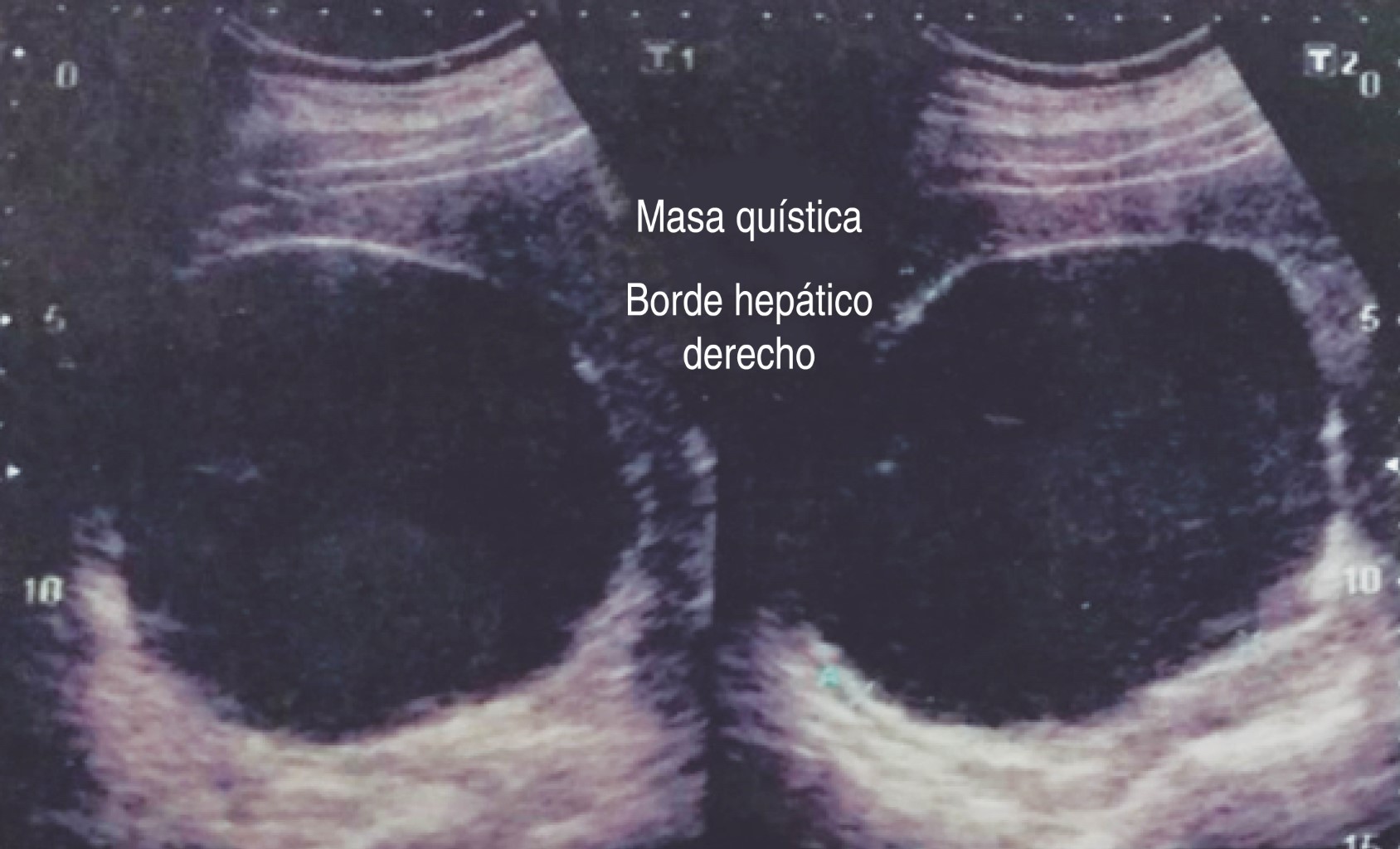 Ultrasonido de marzo reporta hígado de tamaño, forma y situación normales con borde inferior derecho irregular, de ecogenicidad heterogénea por presencia de una masa anecoica de forma redondeada y con bordes bien delimitados, paredes delgadas; sugestivo de quiste simple (Figuras 1 y 2).