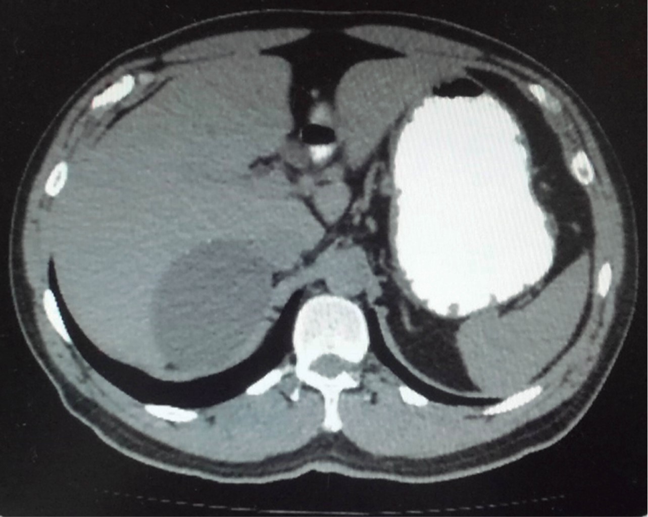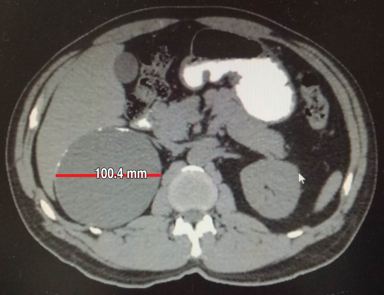 Paciente masculino de 42 años sin antecedentes de importancia acude a la consulta externa de cirugía general. Inicia en marzo de 2018 con dolor abdominal cólico en hipocondrio derecho, leve, irradiado a fosa renal derecha, intermitente y sin síntomas agregados.