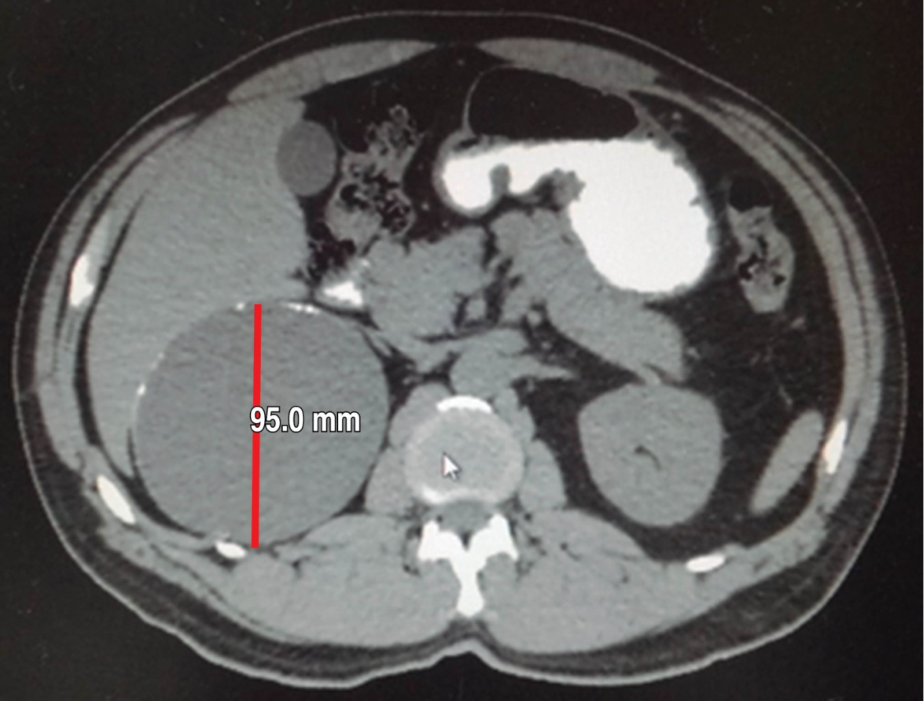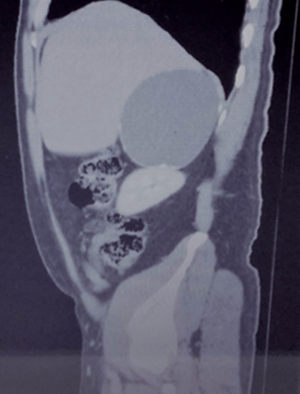 Biometría hemática, pruebas de función hepática, renales, TP y TPT de mayo de 2018 normales. No se realiza cortisol, aldosterona, catecolaminas urinarias ni metanefrinas. Tomografía de mayo reporta en glándula suprarrenal derecha imagen hipodensa con diámetros máximos de 101 mm, calcificaciones en su interior con efecto ocupativo y compresivo sobre las estructuras vecinas (Figuras 3, 4, 5 y 6). Completándose su valoración preoperatoria por medicina interna, se programa abordaje quirúrgico anterior abierto y bajo profilaxis antibiótica con ceftriaxona 2 g en dosis única, se realiza incisión subcostal derecha, destechamiento con electrocauterio de quiste suprarrenal derecho de 10 × 9 cm, con adherencias al hígado, contenido de aproximadamente 400 ml de líquido hialino y calcificaciones de alrededor de 20 × 40 mm en su interior. Se coloca drenaje abierto, penrose de ½" (19 mm) en espacio subfrénico ante la sospecha de hemorragia postoperatoria.