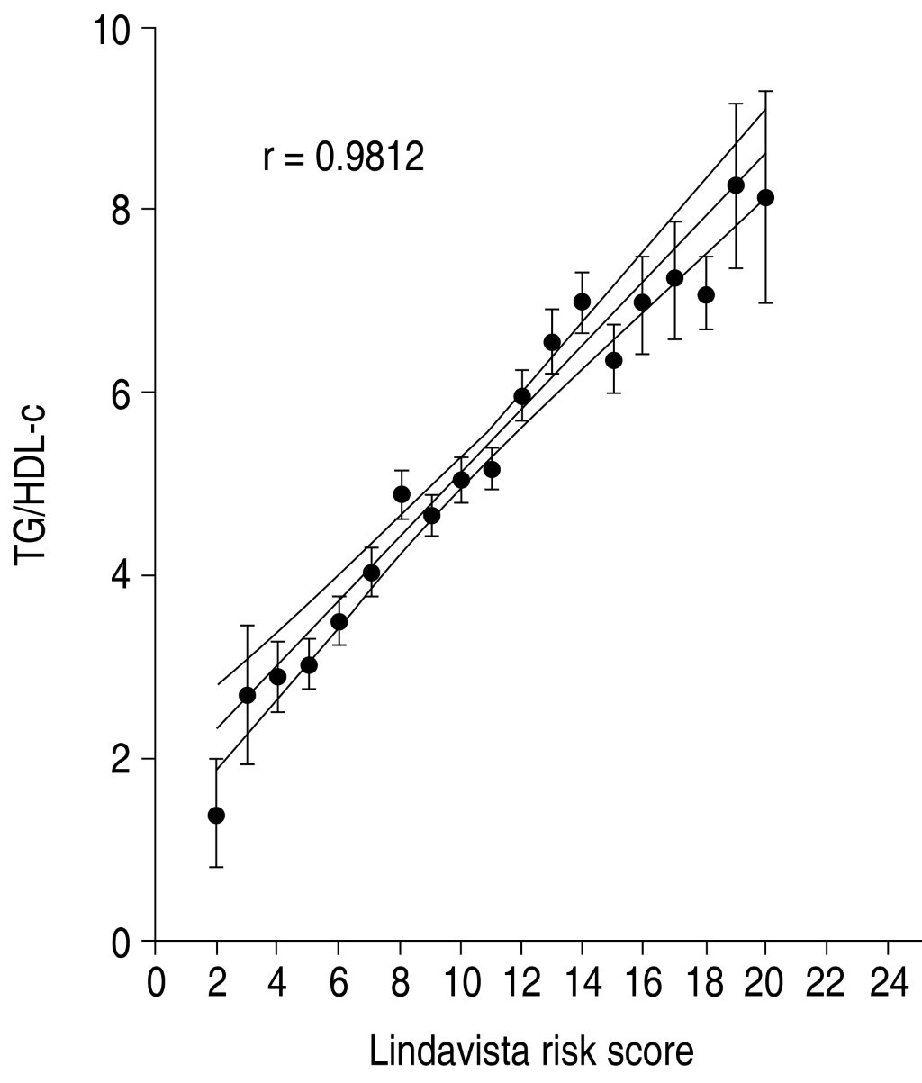 Calibrating the "Lindavista risk scale". The risk scale was calculated in all cohort's participants. To calibrate the meaning of these numbers, we use an atherogenic index, national and internationally proven as a reliable and simple risk.