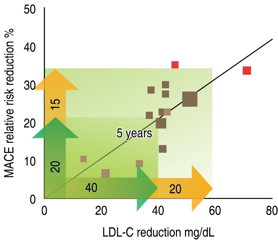 This first meta-analysis included 90,000 individuals in 14 RCTs and analyzed the benefit of treatment with statins (moderate-intensity statins) versus control or placebo. The now-classic results showed that treatment with statins for five years, with a reduction of 1 mmol/L in LDL-C (≈ 40 mg/dL) is associated with a 20% relative risk reduction for an ASCVD (cardiovascular death, non-fatal myocardial infarction, non-fatal stroke, and/or coronary revascularization). On average, 0.50% relative risk reduction for each mg/dL decrease in LDL-C (Figure 1).