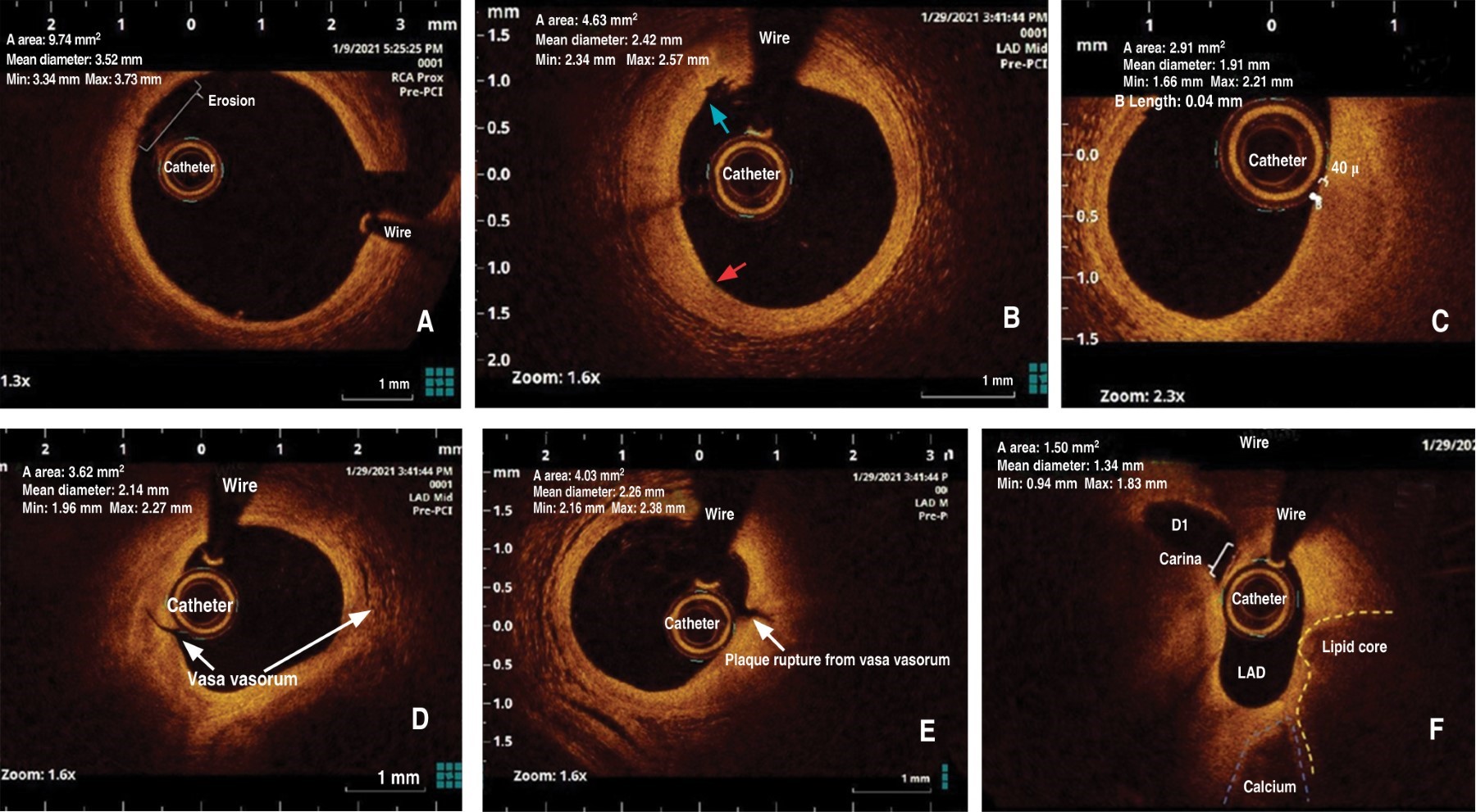 Several diagnostic tools, aimed to visualize the anatomical aspects of the atherosclerotic plaque in vivo, such as the optical coherence tomography (OCT) obtained during cardiac catheterization have been recently developed. This imaging tool can distinguish the coronary arteries' layers with high resolution, well beyond the intravascular ultrasound. The sensitivity and specificity may reach over 90% for detecting fibrous plaque, fibroatheroma, and fibrocalcific plaque. It may detect very small processes such as microthrombi, erosion, ulcers, macrophage aggregates, calcific nodules, lipid core, thin cap, vasa vasora, microdissections, and intra-plaque hemorrhage.19 Some examples of images obtained in our catheterization laboratory show some of the aspects described above (Figure 1).