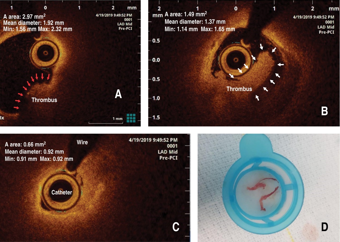 Interestingly, if thrombosis develops, the color of the thrombus, white or red, is important not only for the histological (more fibrin and fewer cells in the white) differences but several features that finally give the latter a better prognosis and response to treatment. The white thrombus is smaller than the red, occurs in smaller vessels, and associates with smaller thrombus burden, lower creatine kinase-MB and troponin, higher post-procedural TIMI-3 flow and blush grade, and lower ischemic time. One-third of myocardial infarctions display white thrombi.27 The OCT detects very small thrombi and can differentiate white from red. The white one is low-backscattering projections within the lumen, and the red is a high-backscattering mass protruding into the artery lumen, with signal-free shadowing (Figure 2).28