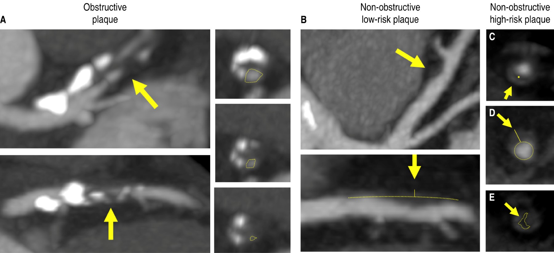 Background. There are mainly two different types of atherosclerotic coronary artery disease (CAD) that can cause acute coronary syndromes (ACS), the obstructive CAD (OCAD) and non-obstructive CAD (NObCAD). OCAD is traditionally clinically recognized by causing a ST-segment elevation during myocardial infarction, by sensitive biomarkers, by high-grade coronary stenosis in coronary computed tomography angiography (CCTA), and by the luminography of the invasive coronary angiography (ICA). However, the identification of NObCAD remains challenging if we study the patients only with "standard imaging modalities" and criteria. It is imperative to learn how to recognize the NObCAD since it contributes to the burden of atherosclerosis. In some groups, such as young women, it represents the majority of cases of ACS. NObCAD causes ACS with significantly lower cardiovascular risk at baseline in those patients, typically categorized as low-risk patients, and a subsequently lower likelihood of death or MACE. However, they are still at high risk for cardiovascular mortality and morbidity based on their underdiagnoses and undertreatment.6