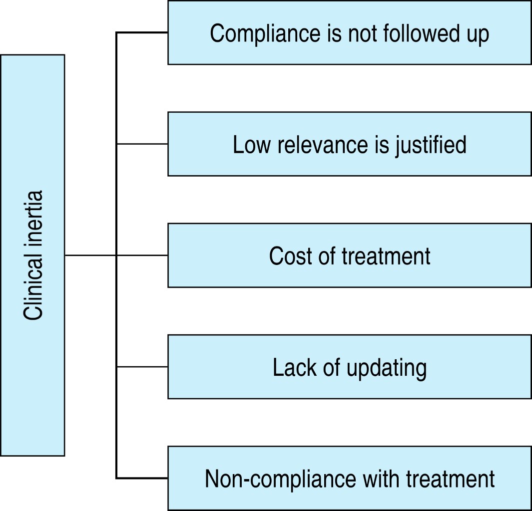 For a strict control of lipid concentrations, both physicians and patients need to become aware of what is being prevented. On one hand, physician must have the clinical sensitivity to do so, overcoming daily problems in care in public and private health services. It has been observed that both physicians and patients pay little attention to attain a perfect lipid control. The causes are diverse, and within them, some are attributable to practitioners, and other to patients themselves or to the health care system. Sometimes a physician does not intensify the treatment or does not pay attention to a perfect lipid control due to ignorance or to the lack of updated knowledge, that justify the relevance of a perfect lipid control, or because the professional underestimates the problem.1 The saturated consultation of many physicians and the lack of knowledge about what to prevent, tend to create an ambience of conformism about the patient´s health. Additionally, some physicians do not believe in the long-term positive impact of lipid control, and they pay little attention in caring, "trusting" that no major CV event will occur. On the other hand, many patients may abandon or reduce the vigilance in this matter, either due to the cost of treatment or because of the misconception that establishes that medications must be taken only when there are symptoms. On many occasions, after the physician prescribes a treatment, the patient decides not to take it, or to halve the dose, breaking up treatment compliance. When for some reason the treatment is not intensified or monitored, the phenomenon has been called clinical inertia.1 The causes for which clinical inertia occurs are summarized in Figure 1. Several studies have shown that close monitoring of patients provides favorable long-term results. An example is the MIRVAS study, which encompassed 247 patients that were randomized into two groups, one with programmed visits at 2, 5, 12, 24 and 36 months. These visits were aimed to monitor the strict control of risk factors, including lipid serum concentrations and to advise about a healthy lifestyle. In the other group of 126 patients, these ones have a single appointment a year, delegating in themselves the responsibility of their own treatment. This situation occurs usually in many health systems. The intervention group had a higher survival rate compared to the other group (3-year survival rate 97.4 vs 85.5%, p = 0.003). The intervention group results demonstrate that the comprehensive and intensive control of CV risk factors reduces the absolute risk of CV morbidity by 28.5% and total mortality by 11.9%.2 This simple study shows the importance of forming a group of health professionals who have the necessary preparation to detect severe pathological scenarios in dyslipidemia, with defined study protocols and precise therapeutic surveillance. Hence the need to have a continuous patients care system, going from hospital attention of severe clinical conditions to primary care.3