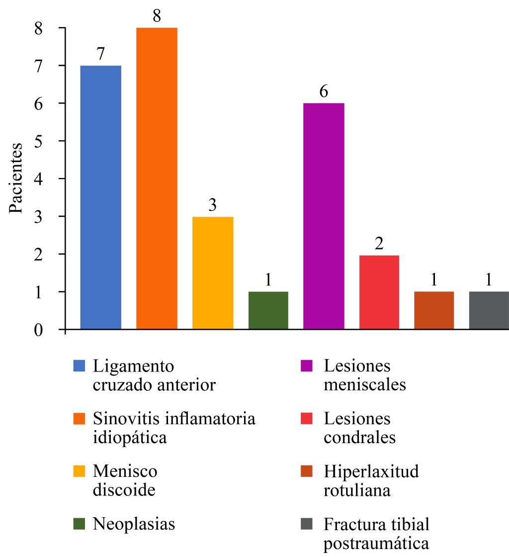 Introduction: Diagnosis and management of congenital and traumatic articular ailments carry an additional problem in young people. Arthroscopy has improved treatment of these injuries, which are more frequent. Objective: To describe the experience of arthroscopic handling in pediatric patients affected with knee disease, managed at a third level hospital in Puebla, Mexico. Material and methods: Descriptive, retrospective, cross sectional study performed in patients having knee disease, admitted at Unidad Médica de Alta Especialidad Hospital de Traumatología y Ortopedia Puebla, from March first, 2015 to February 28th, 2018. Lysholm and IKDC functional scales and Tegner functional satisfaction scale were applied at zero, six and twelve months. Student's t and Wilcoxon tests were used. Results: 29 young ones of five to 17 years of age became recruited, slightly more women (62.06%). The most frequently affected limb was the left one, with 55.17%. The disorders found are: discoid meniscus, harm of the anterior cruciate ligament, idiopathic inflammatory synovitis, tumor, meniscal injury, chondral damage, patellar hyperlaxity. Lysholm and IKDC registered improvement from the first semester. Tegner registered their ability to go back to previous daily occupations. On the Lysholm scale, there was improvement at six months. On the Tegner scale there was complete incorporation to their activities (previous to the presentation and surgical intervention). At six months subsequent to treatment, the IKDC evidenced improvement and recovery, and reintegration to their activities. Statistically significant differences (p ≤ 0.01) resulted, in measurements at zero, six and 12 months. Conclusions: Congenital and traumatic illnesses were found, the latter ones sports related. Arthroscopic approach registered positive functional results in these children.REFERENCES