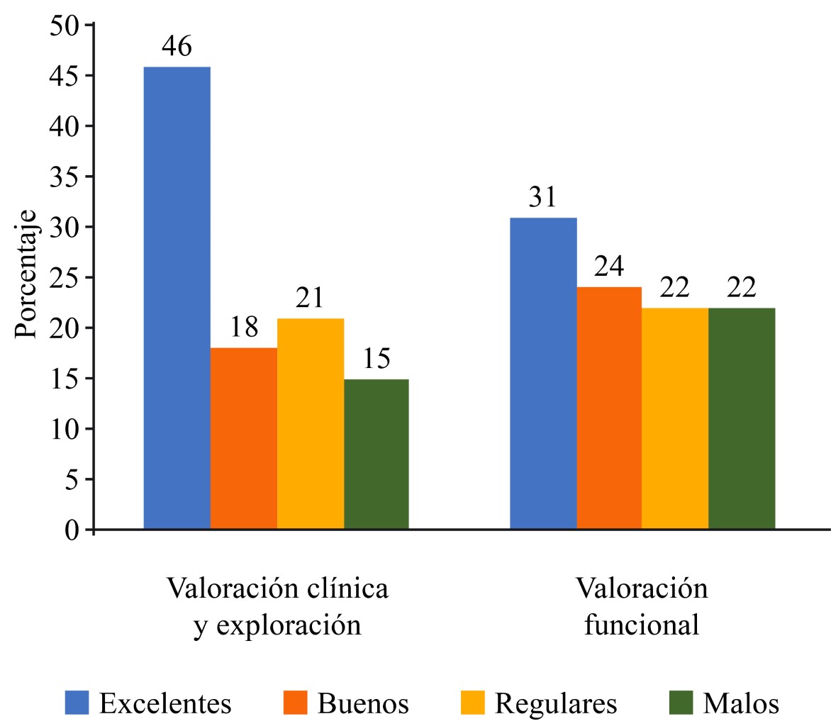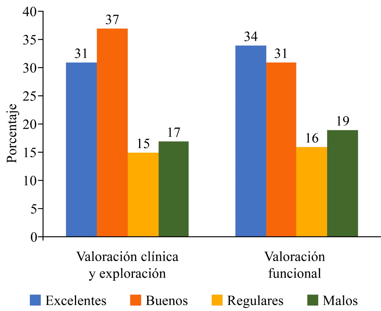 Conclusions: No statistically significant difference was observed between age, gender, laterality of injury, or between number of patients with excellent results, good regular and bad according to the scale used. The high percentage of poor results in both groups of this series for the knee prosthesis is striking.