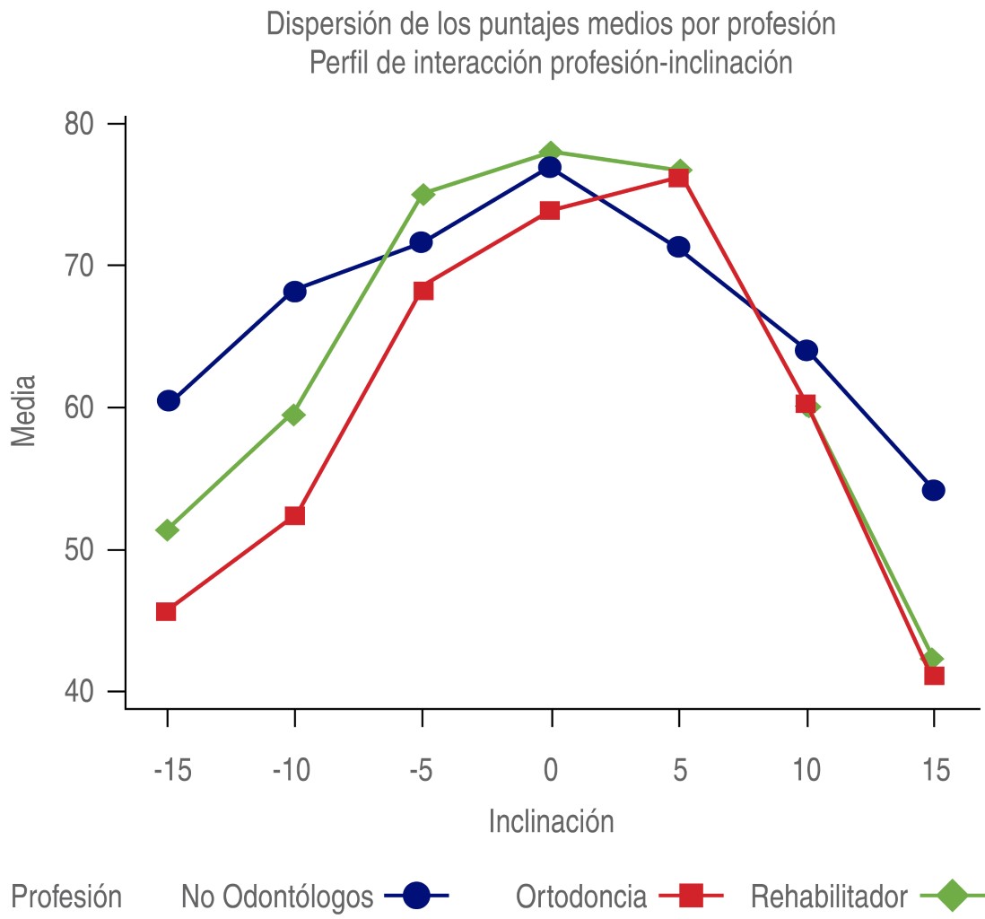 The analysis also revealed that the interaction of the two factors was significant for a 5% significance level (p-value = 0.047). The interaction profile showed that the inclination of the central incisor can be perceived differently according to the respondent's profession. For example, non-odontologists (Non-ODs) evaluated both retroclination and severe proclination (15 and 10 degrees) higher than oral rehabilitators. However, they evaluated minor inclinations (-5 to 5 degrees) lower than the rehabilitators. On the other hand, orthodontists evaluated with lower scores all inclinations compared with non-odontologists, with the exception of a 5-degree proinclination. In that case, they evaluated it higher than the non-odontologists (Figures 1 y 2).