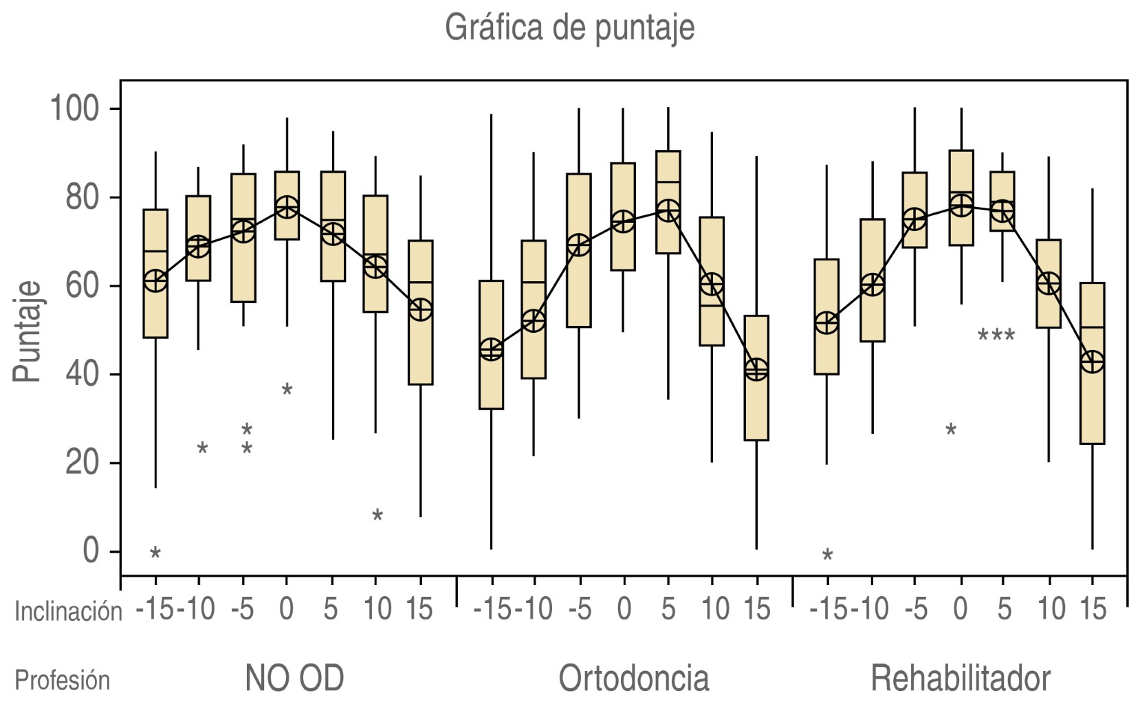 The analysis showed that the inclination of the central incisor had a statistically significant effect on the score or esthetic perception of the smile (p = 0.00). Likewise, the effect of the profession on the score or esthetic perception of the smile was significant (p = 0.00).