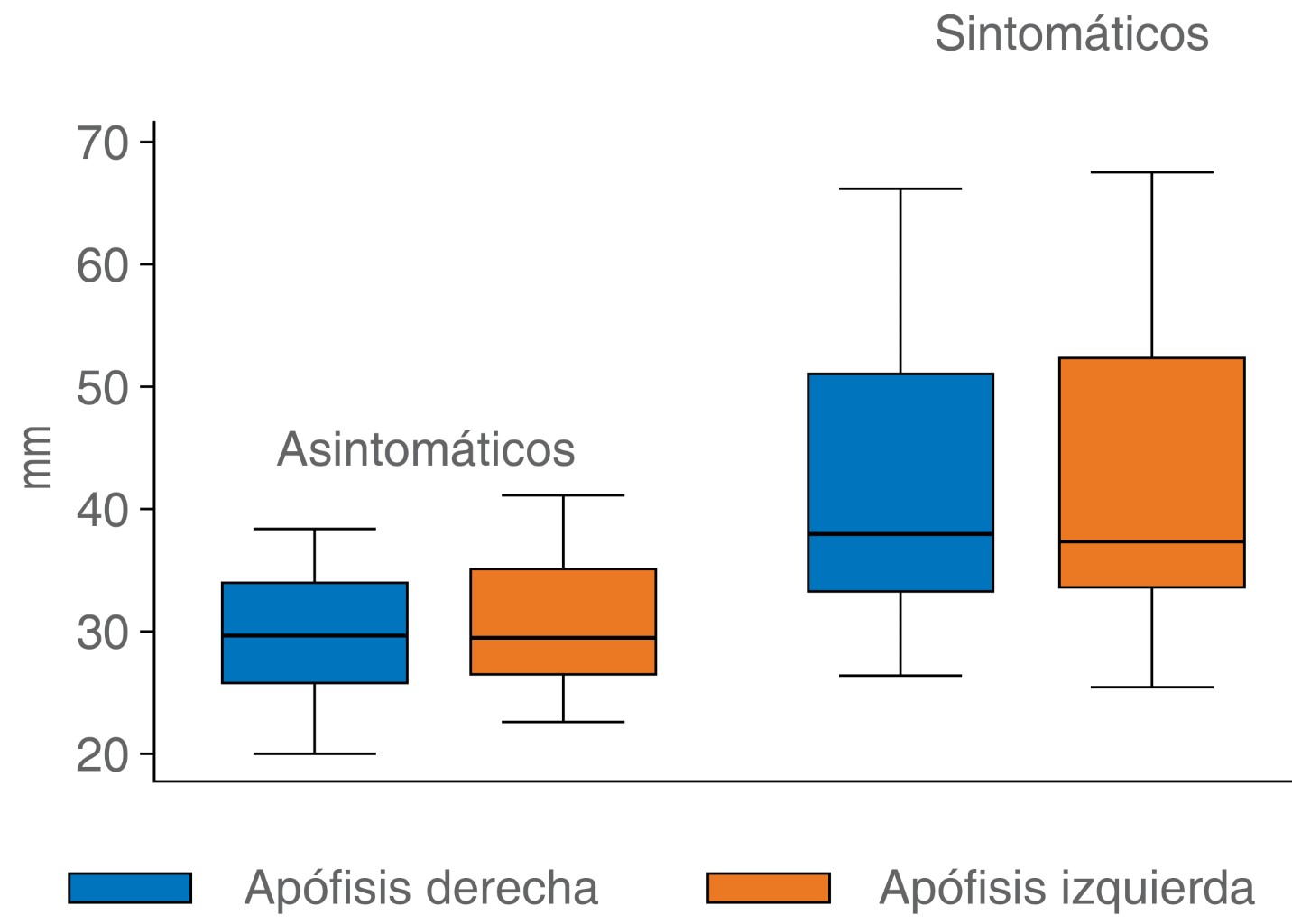 The normal length of the SP varies considerably in most people, about from 20 to 30 mm. In general, it is considered elongated when it measures more than 25 mm,6,13 although some authors mention from 30 mm onward.15 The average length that we found on the right side was 35.35 mm and on the left side, 35.8 mm, which coincides with what was reported by Nazar et al.15