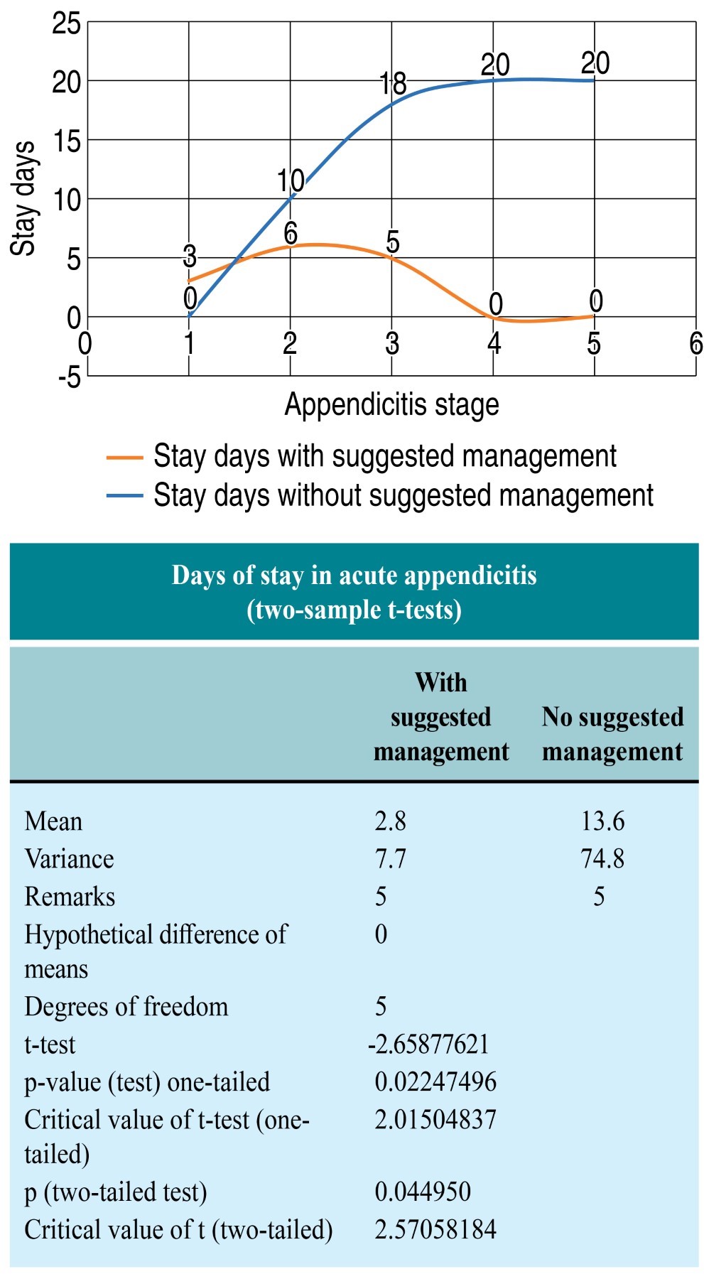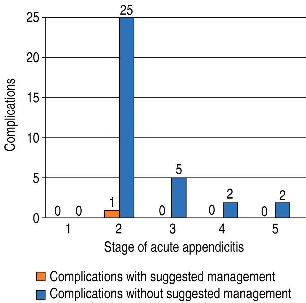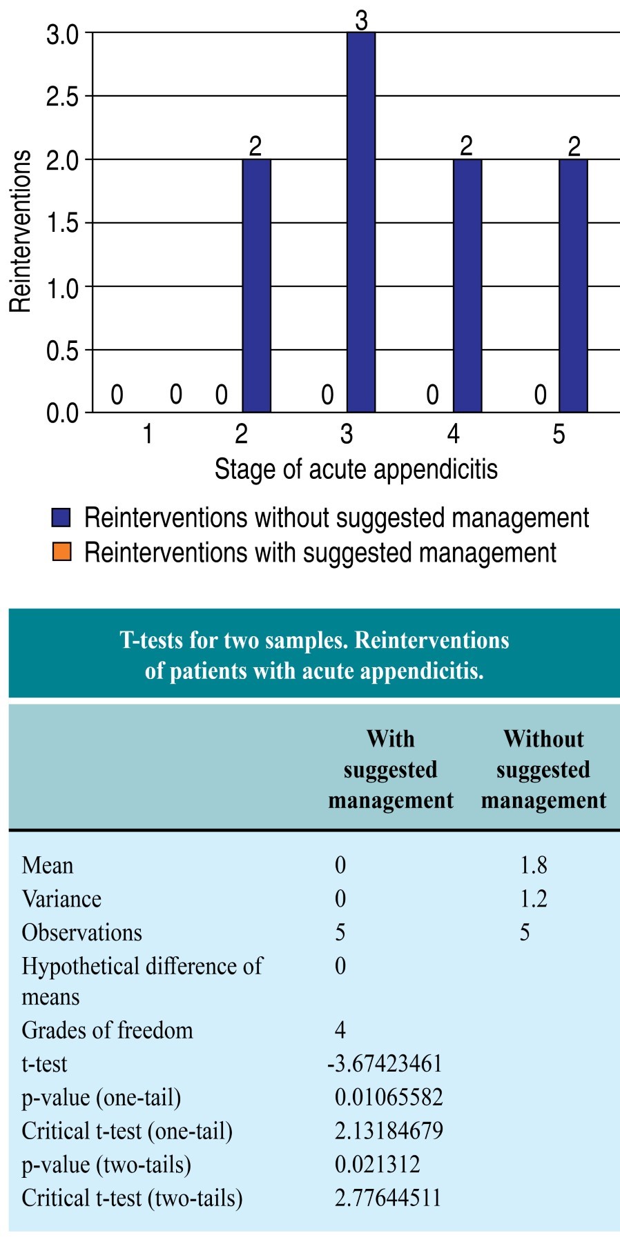 The suggested classification presented in this study indicates that it is possible to homogenize the characteristics of the surgical findings, to stage them, and gives us a guideline to decide an adequate surgical management considering the stage of the appendix, the peritoneal cavity, and the general condition of the patient. As can be seen in the graphs, the Student's t test showed a significant statistical p value < 0.05, which gives us the guideline to suggest this classification. In Figure 1 we can observe that the mean number of days of stay in patients with suggested management was 2.8 days compared to 13.6 days in cases without the suggested management and p value = 0.04, barely significant. In Figure 2 we found a higher rate of complications in stage 2 patients without suggested management with a mean of 6.8 compared to 0.2 in patients with suggested management. And in Figure 3 we observed a higher rate of reinterventions in stages 2, 3, 4 and 5 without the suggested management with mean of 1.8 compared to 0 in patients with the suggested management, with a p value = 0.02.