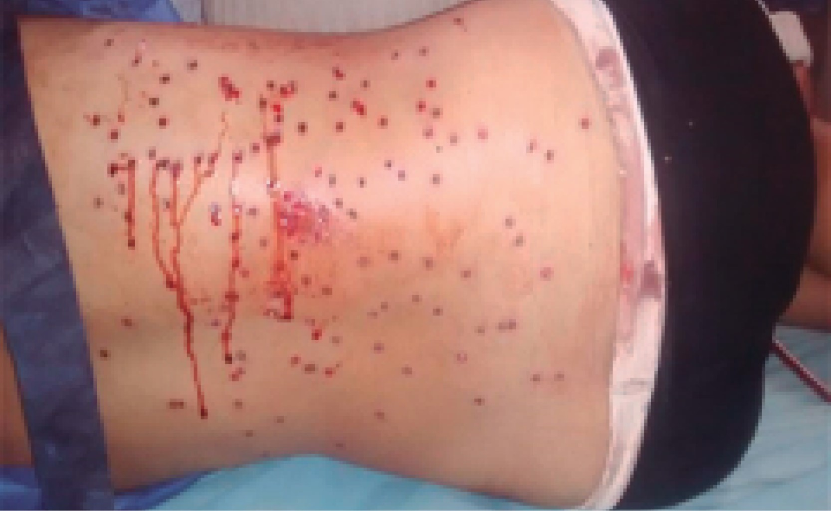 Physical examination: Her heart rate was 110 beats per minute, blood pressure of 90/50 mmHg, respiratory rate of 21 per minute a temperature of 36.6 oC. Her skin was brown with generalized mucosal pallor and a capillary filling less than 3 seconds. The cardiopulmonary examination showed a symmetrical thorax, hypo-expandable predominantly in the right hemithorax. Multiple gunshot holes in the lower region of the left posterior hemithorax and lower third of the right posterolateral hemithorax were seen with diminished respiratory sounds in the lower third of the right hemithorax without aggregated abnormal sounds. The heartbeat sounds were heard rhythmic and regular without any murmurs or gallop rhythm. Her abdomen was distended, with decreased hydro-aerial sounds, painful on palpation with signs of generalized peritoneal irritation. In the lumbar region multiple firearm projectile orifices in bilateral lumbar region predominantly on the right (Figure 1) were observed. The rectal examination showed a tonic external anal sphincter, blistered stool, and a bulging cul-de-sac. The extremities were symmetrical, eutrophic and without edema. Neurologically the patient was conscious and oriented in time, space, person.