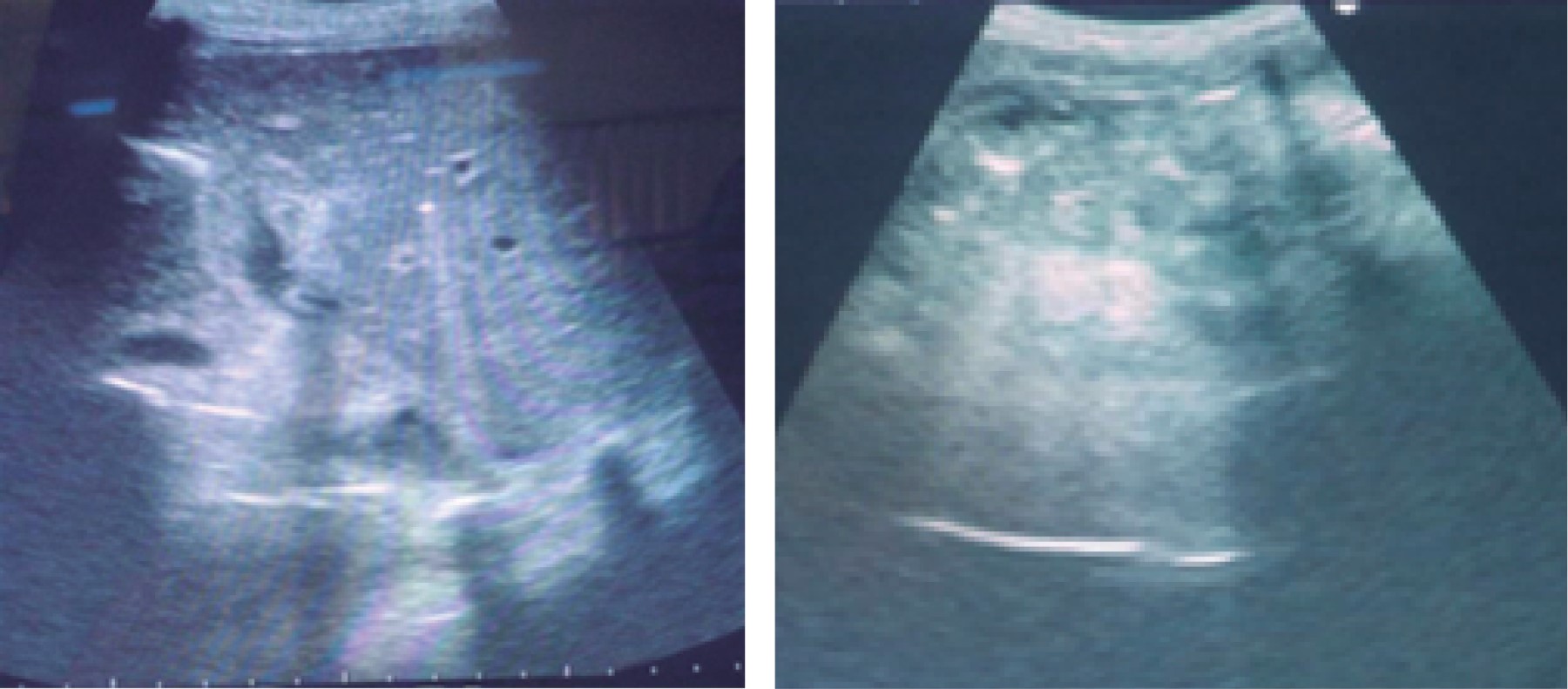 She was evaluated jointly with the nephrology, nutrition, and neurosurgery services. She received three units of red packed cells during her hospitalization. She was monitored with water balance control, paraclinical and hemodynamic control, drain output, and pleural tube management, plus daily wound healing. On the fifth day of hospitalization, the drain placed in the cul-de-sac was removed due to lack of output. On the ninth day, there was a spontaneous exit of the drain placed in the Morrison space while still maintaining biliary output. an ultrasound-guided drain re-canulation was performed (Figure 3). On the tenth day the thoracic drainage tube was removed due to good pulmonary expansibility. She was then discharged from the hospital.