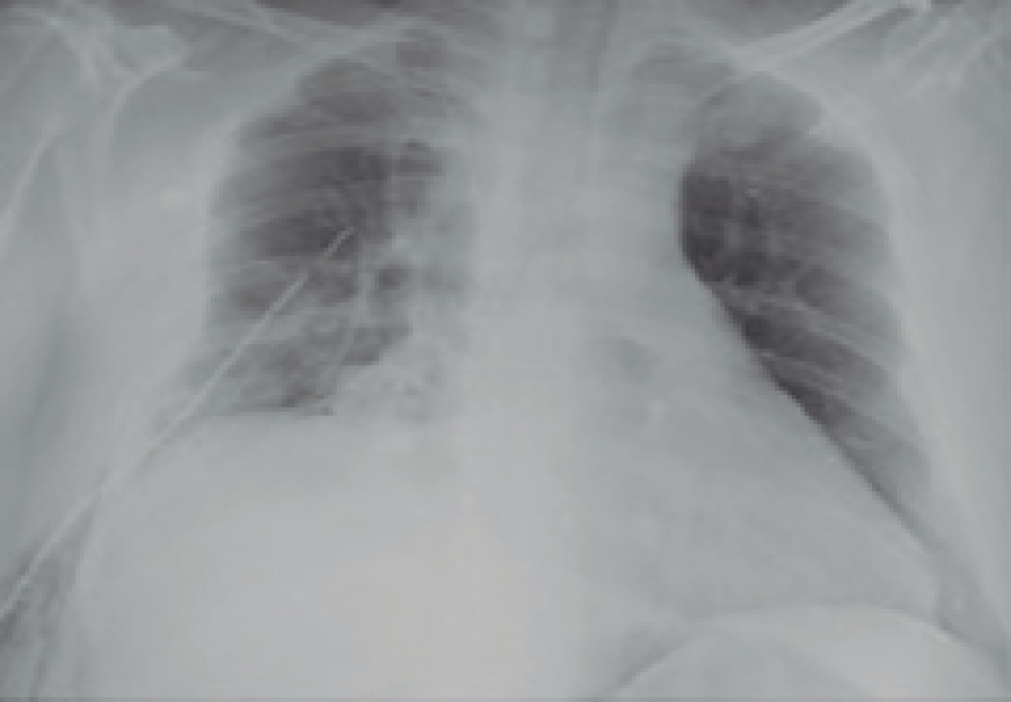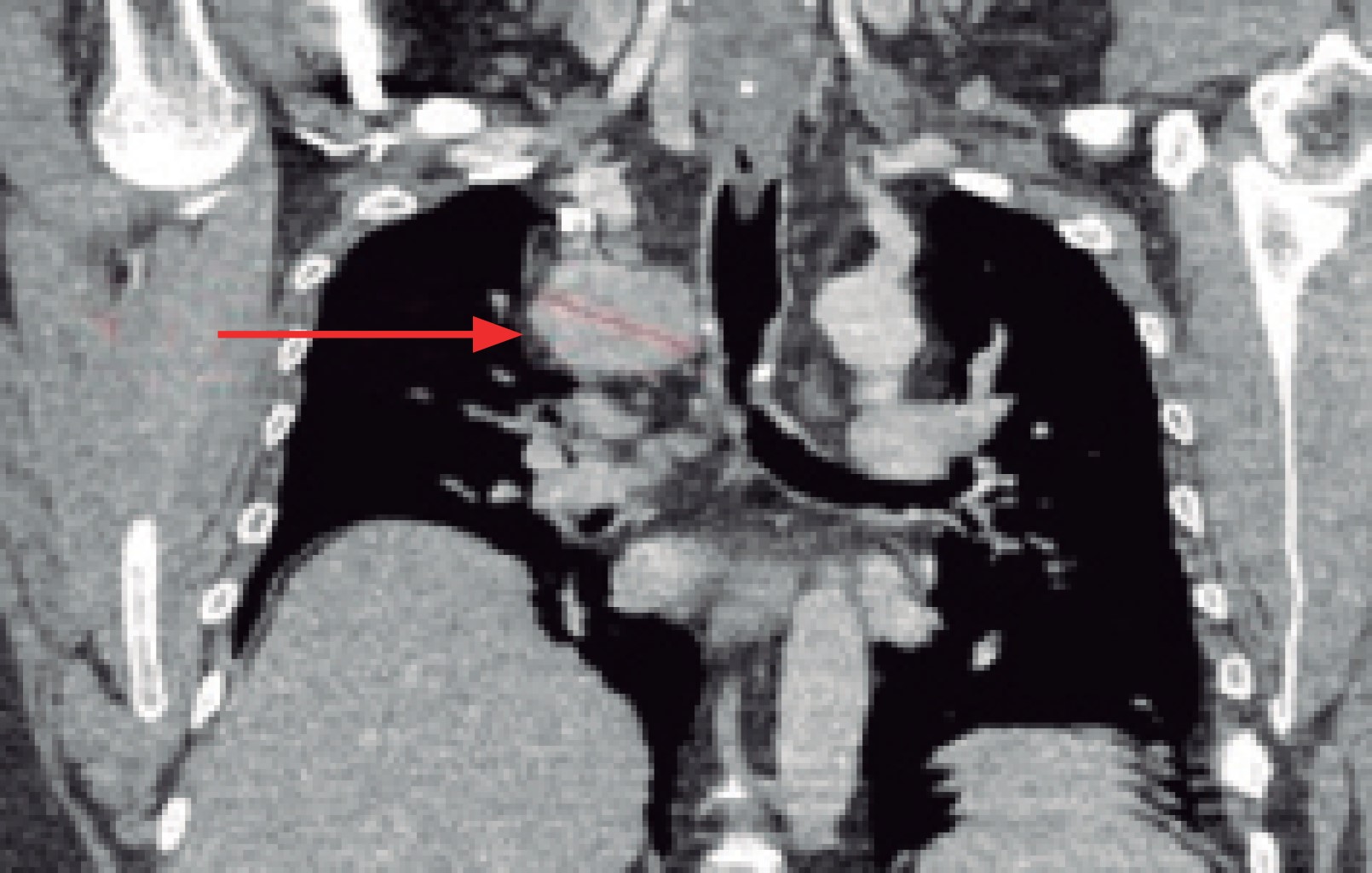 This is a 47-year-old man who had been managed for 15 years for gout, so he went to rheumatology consultation, where he refers respiratory symptoms of three months of evolution characterized by dry cough in accesses, in addition to facial edema and upper extremities. In his last consultation he requested a routine chest X-ray where a mediastinal widening was observed, so a computed tomography scan was performed, which showed a mass in the middle mediastinum of approximately 7 × 5 centimeters in diameter, with extrinsic compression of the superior vena cava and azygos vein, elevation of the homolateral hemidiaphragm, in addition to severe hepatomegaly (Figure 1).