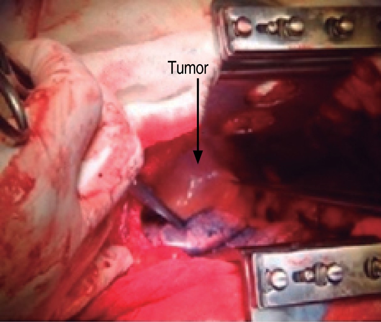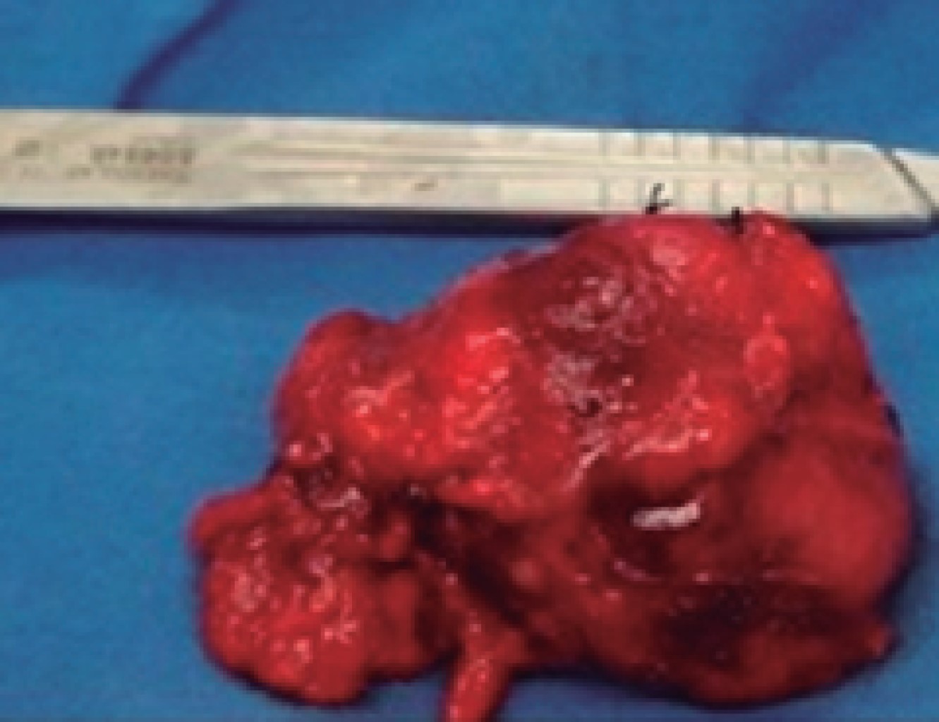 A right posterolateral thoracotomy was performed because we did not have equipment to perform minimally invasive surgery, finding a tumor in the middle mediastinum of approximately 7 × 5 × 4 cm, with a hard consistency, encapsulated, and attached to the lateral wall to the superior vena cava, upper edge of the azygos vein and intrathoracic trachea, and to its lower portion to the azygos vein (Figure 2). The tumor was completely excised (Figure 3). In the immediate postoperative period, the patient showed no complications and was extubated. The control thoracic X-ray showed complete pulmonary expansion (Figure 4).