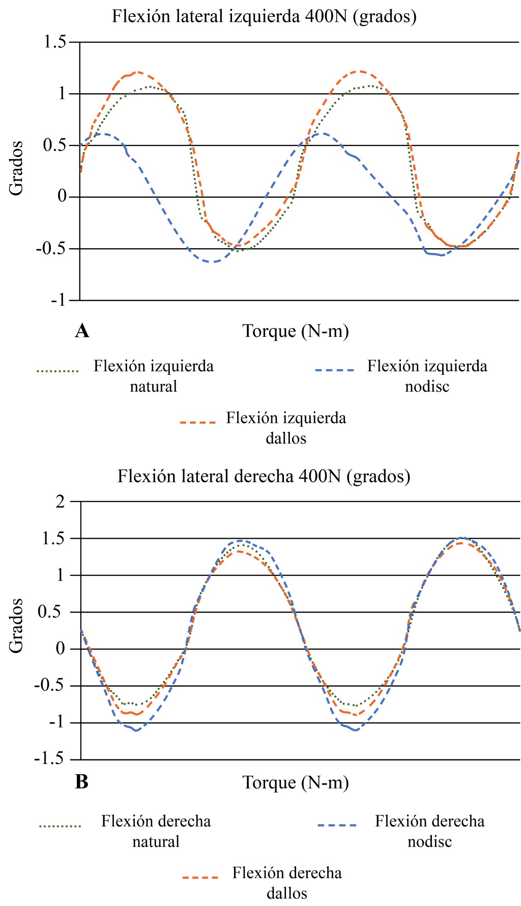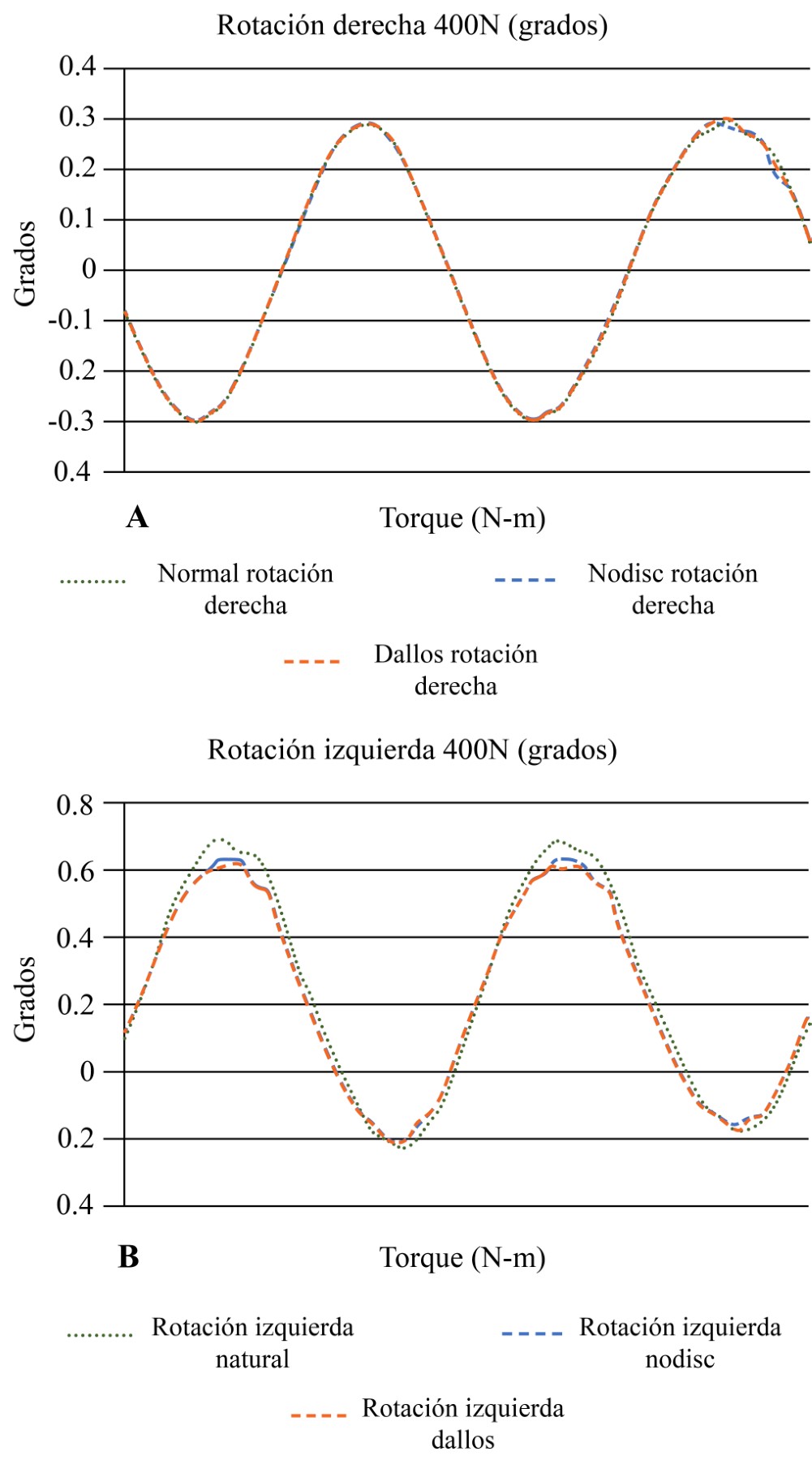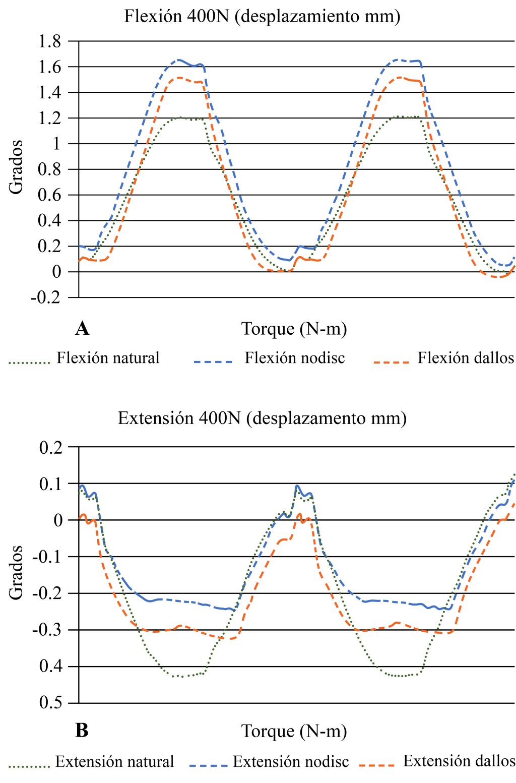 Material and methods: The lumbar segment was mounted in a servo-hydraulic multiaxial simulator. Mobility ranges of flexion, extension, lateral flexion and axial rotations were simulated under three conditions: 1. Natural segment, 2. Discectomy segment, and 3. Disectomized segment plus ligamentoplasty with Dallos