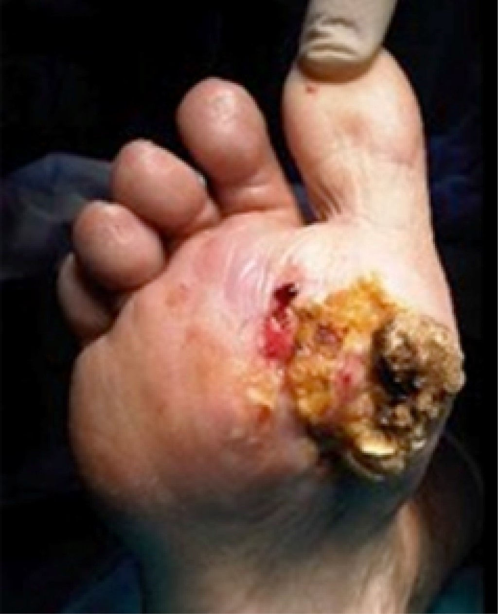 A 76-year-old woman presented with a 5-year history of forefoot pain secondary to a soft tissue mass on the anterior sole of the right foot. The lesion was diagnosed and treated initially as a plantar wart with various unsuccessful procedures (such as simple excision, photodynamic cycles therapy, shaving, etc.), but continued to slowly evolve causing infection of the surrounding soft tissues, which required multiple debridement procedures. The results of the samples taken revealed a polimicrobial infection (P. aeruginosa, E. faecalis and E. coli), which was treated with a specific antibiotic regimen without clinical improvement.