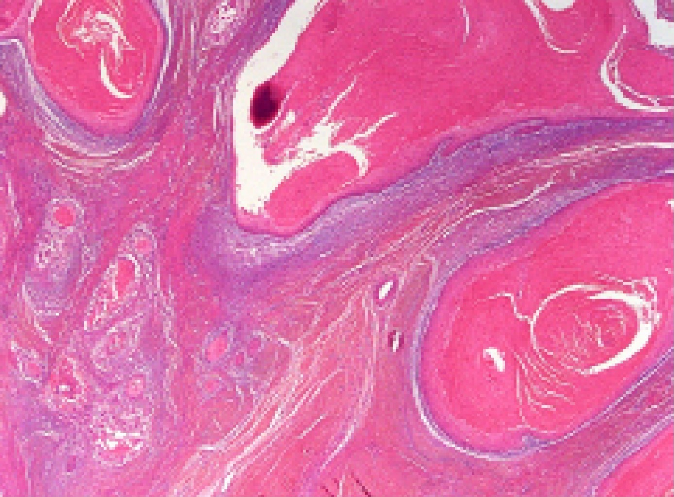 Given the disparity results of the imaging studies, an excisional biopsy of the plantar lesion was performed. Intraoperatively, it was shown that the invasion of deep layers would make it unfeasible to get a peritumoral wide margin free of tumor. The pathological study revealed the existence of a well-differentiated keratinizing squamous carcinoma, ulcerated and infiltrative, invading the surgical margins (Figures 2, 3 and 4). The microbiological study of the intraoperative samples various bacteria were isolated: Proteus mirabilis, Corynebacterium sp. and S. aureus.